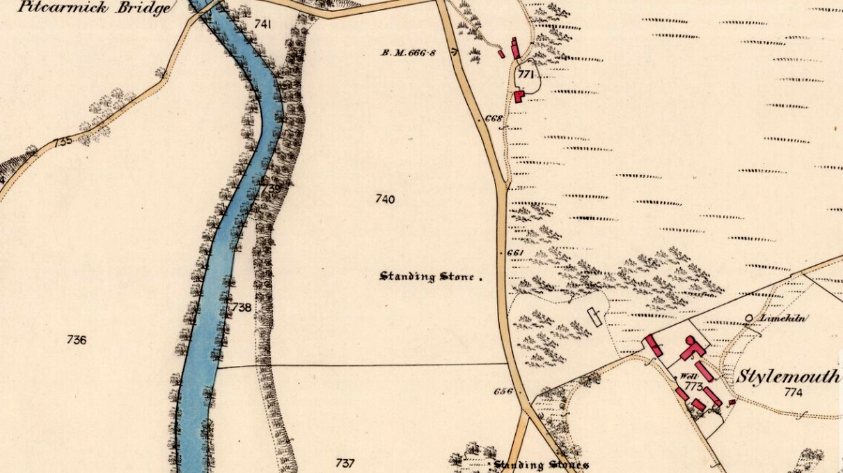 “At a point almost 176 yards due north of (the) two stones is a tallish and unshapely monolith standing but a few yards west of the main road. Its most notable feature is the extreme irregularity of its shape. If any proof were needed to show how uncritical were the people who raised such stones, how totally devoid of any regard for symmetry or neatness of contour in the monoliths they set up, surely the ground-plan of this block of rent and riven quartz-veined whinstone, fissured and uncouth in all its parts, would supply it.