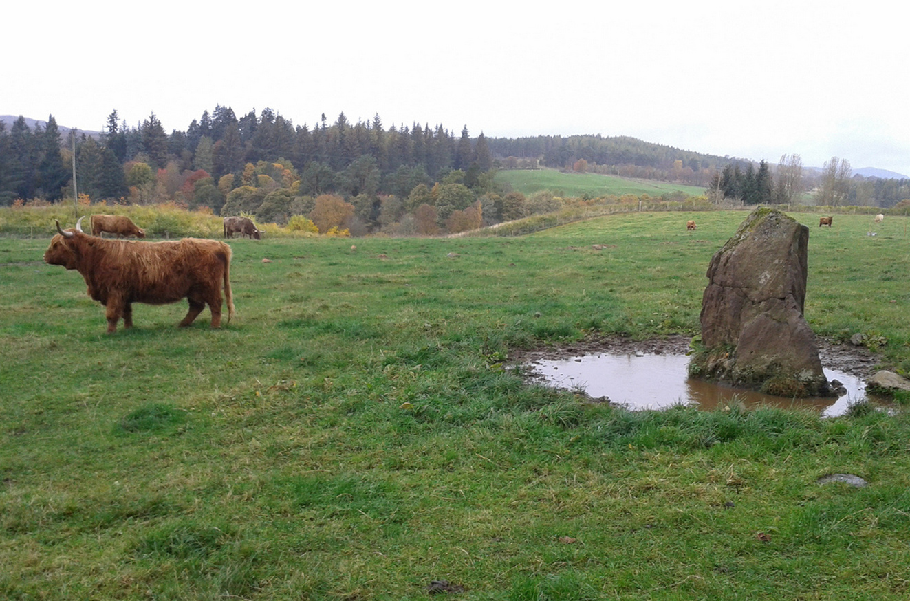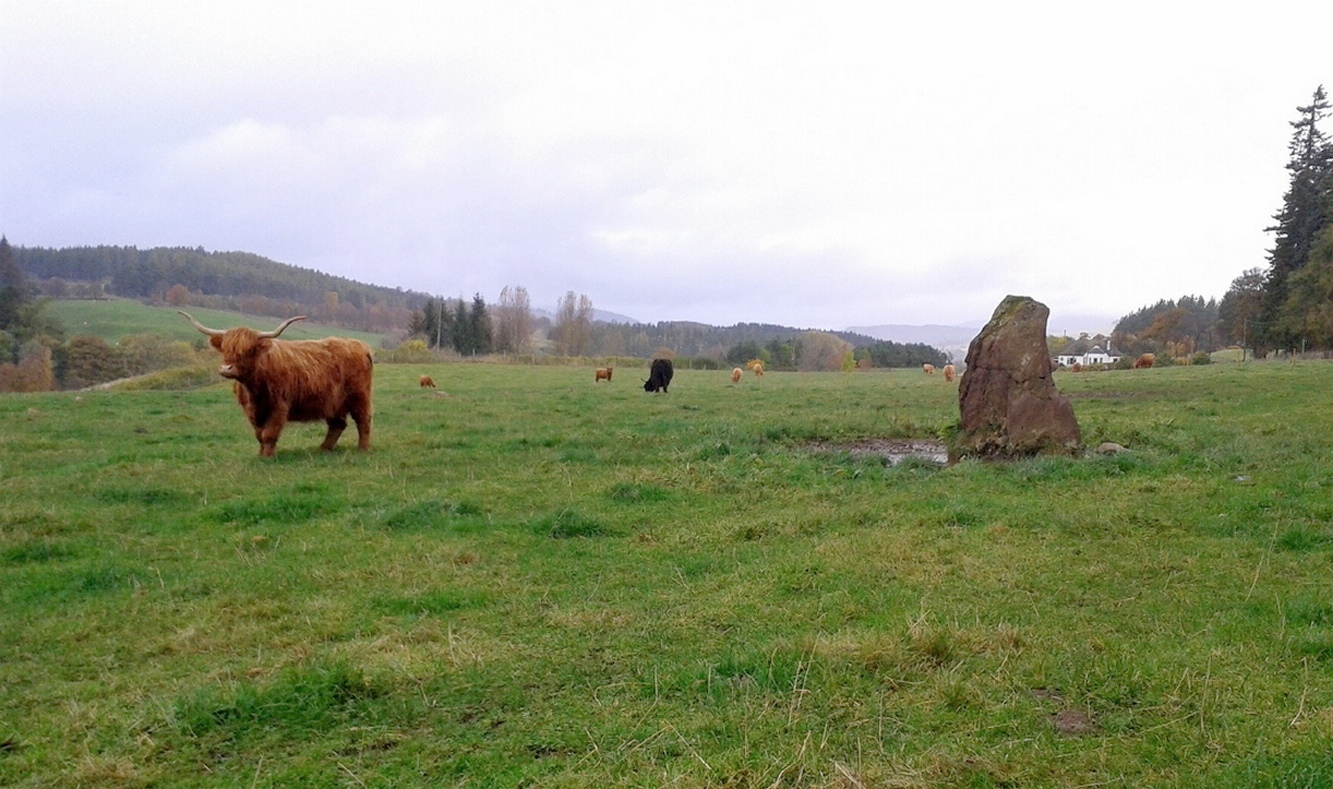 Take the A924 road north of Blairgowrie, between Pitlochry and Bridge of Cally and, about 4.6 miles (7.5km) along, roughly halfway between Ballintuim and Kirkmichael, in the field by the roadside immediately west, you’ll see this conspicuous upright stone standing all alone – unless the cattle are meandering slowly around it! Y’ can’t really miss it.