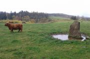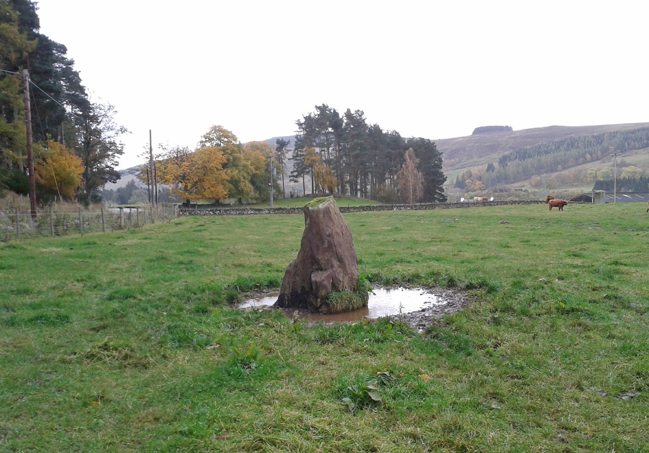 This single monolith that stands today as a cattle rubbing post, may at one time in its distant past have been related to the present pair of standing stones hiding in the small remain of trees 148 yards (135.5m) to the south; although neither Aubrey Burl (1993) nor Alexander Thom (1990) ascribe the stone such an association in their relative tomes on aligned stone rows.