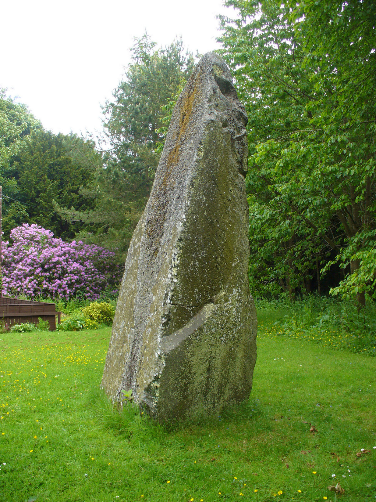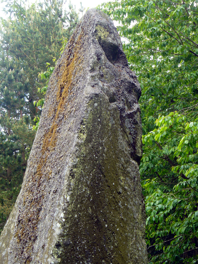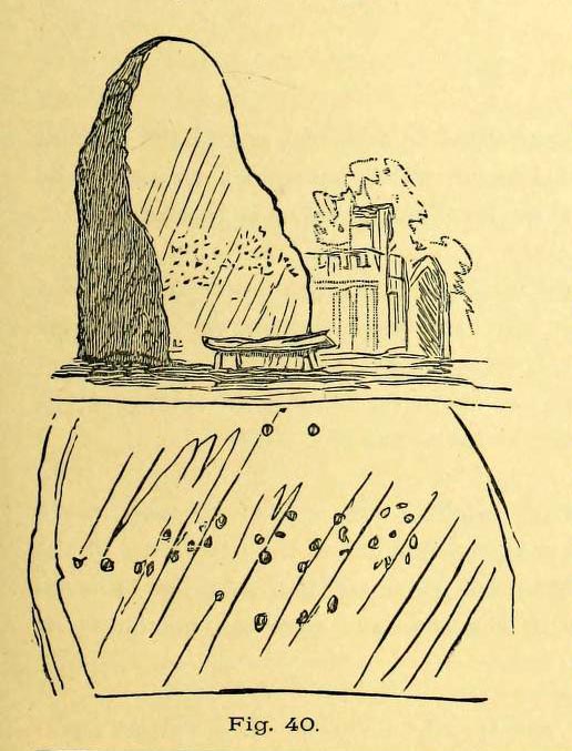 “Rectangular in cross-section, the stone tapers to a point some 3.6m above the ground; each of its sides is decorated with cupmarks, as many as forty occurring on the east face and twenty-four on the west.”