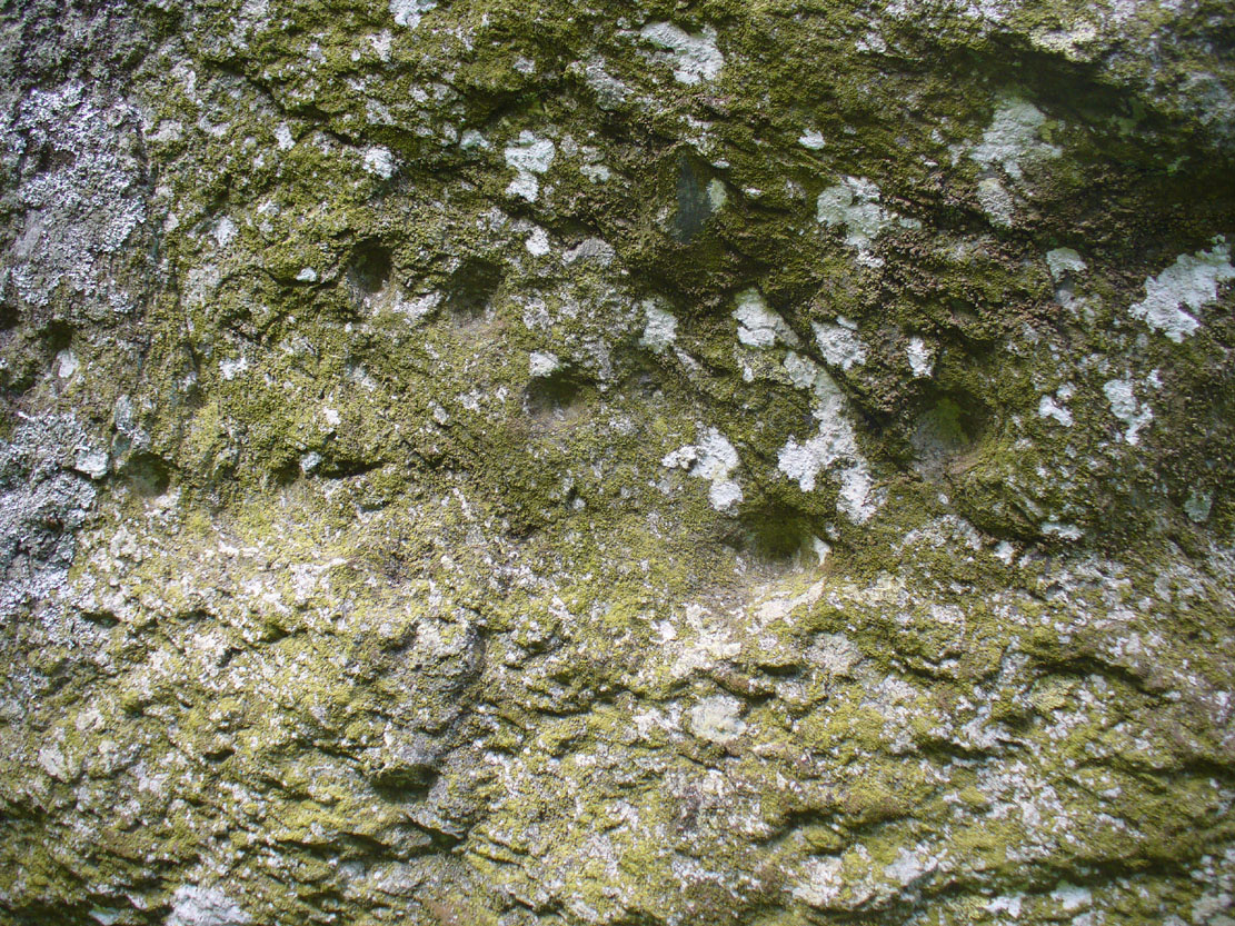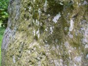 On the northern face of the stone is one possible cup-marking, and three of them are etched onto its south face; but the majority of them, forty, are on its western face, and twenty-five on its eastern side.  The great majority of them on the east and west sides occur roughly in the middle of the stone, almost like a ‘belt’ running across its body.  Those on the eastern face are difficult to discern as a thick layer of lichens covers this side, so there may be even more beneath the vegetation.
