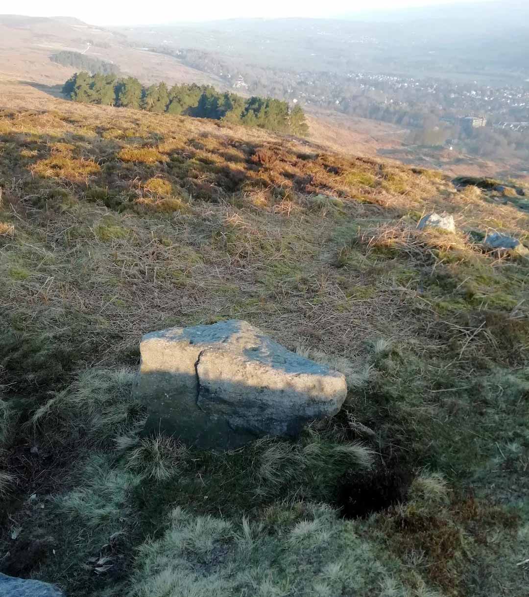 From Ilkley walk up to the White Wells and follow the footpath behind it up to the cliffs, up the stone steps and onto the moor itself. Once you’ve climbed the steps, walk uphill onto the moor for 100 yards, then turn right up a small path for another 80 yards until you reach the large Coronation Cairn with its faint cup-and-ring stone. From here there are two paths heading west: take the higher of the two for just 30 yards where a small group of rocks are by the path-side on your right. The curiously-shaped ‘upright’ one is the stone in question. You’ll see it.