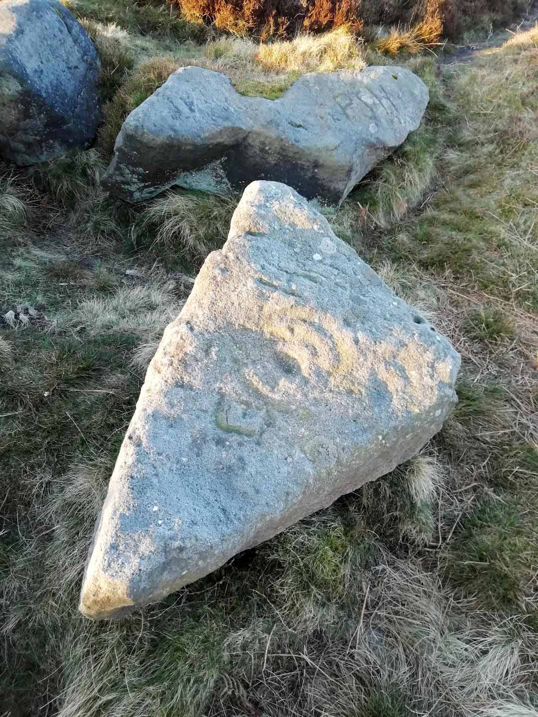 “Small grit rock in possible cairn material, cut all round as if one pedestal, top surface triangular, sloping slightly SW to NE, overlooking Wharfe Valley, in grass and crowberry. Large cup with two vestigial rings, second large cup with vestigial ring. Possible third ring of corner edge (hewn off). Recent carving of initials spoils original carving.”
