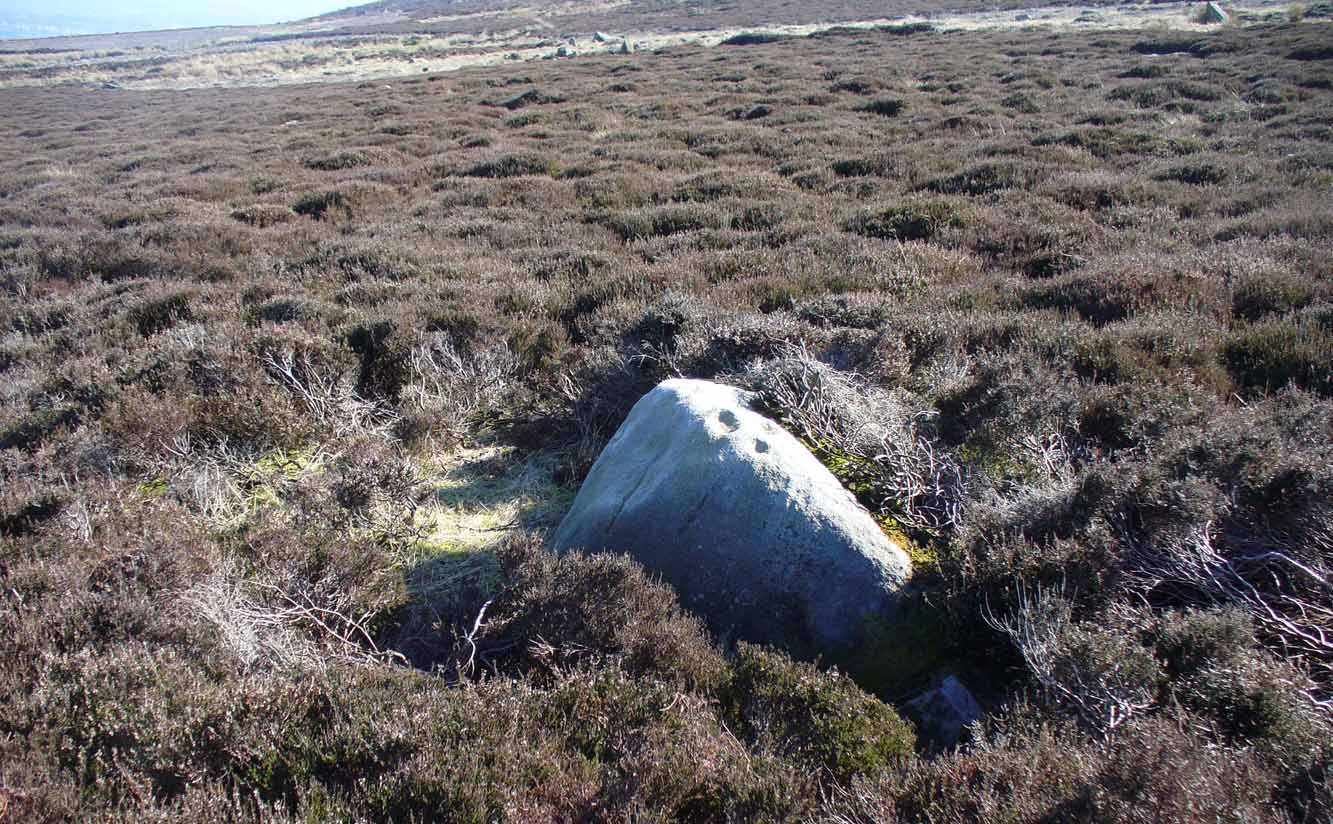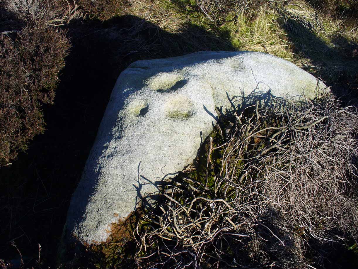 A more definite description of the stone was made in John Hedges (1986) survey where he described it in that usual simplistic form, telling us: “Long rock, its surface on two levels, sloping N to S in heather.  Two large oval cups and one cup at N end.  One clear cup at S end.”
