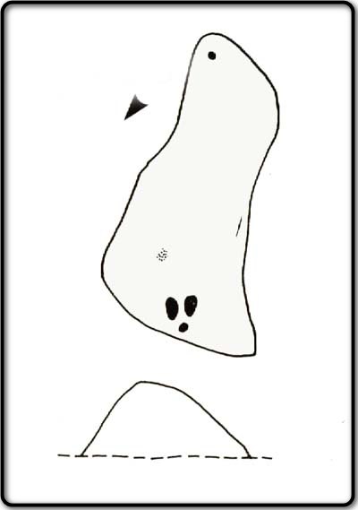 It is these two elongated cups that have the distinct appearance of deer tracks. (another animal with a similar footprint is the goat)  The cup-mark in front of them and the one at the back of the rock may be something relative to the animal.  But more important than this is to recognise that, in lots of cultures, animal tracks are represented in some petroglyphs.  That’s more important to think about when you look at British rock art, than the improbability of this design being such a thing…
