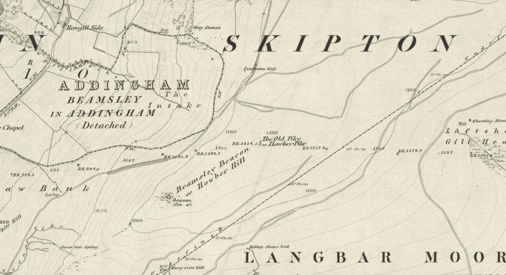 The great place-name authority A.H. Smith (1956) not only echoes this but goes into greater etymological detail, noting that as well as haugr or how being “an artificial mound, a burial mound,” it’s a word that is particularly used in the northern counties. He does note however, that this may not always be the case and can sometime just relate to a “a hill or hilltop resembling an artificial mound.” However, we also find in Smith’s tome on place-name elements that the latter part of ‘Howber’ deriving from beorg, can also mean a tumulus or burial mound. But there are cases where this has been corrupted and means, as Speight states, a fortified hill. So at Howber Pike we seem to have the ancient name of some probable burial site. As for its neighbour a quarter-mile west, the giant cairn of Beamsley Beacon is also known as the Howber Hill….