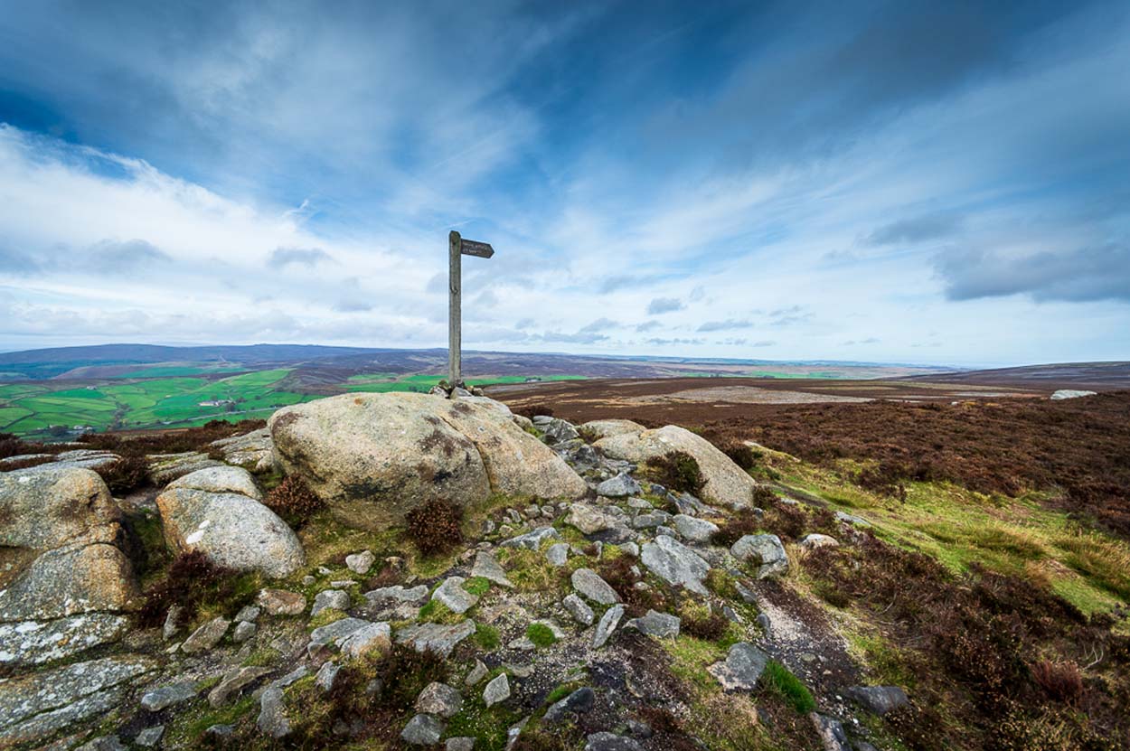 At the highest point of these hills where the moorlands of Langbar and Beamsley meet, is this prominent rocky pile on the same skyline as Beamsley Beacon. The two are ancient cairns, both robbed of most of their stones, but still a good site to sit and behold the vast landscape which reaches out for miles in all directions. And, from this highest point, looking south to the highest point across the Wharfe valley on Ilkley Moor, the remnants of another giant prehistoric cairn is visible: looking across at each other, eye to eye.