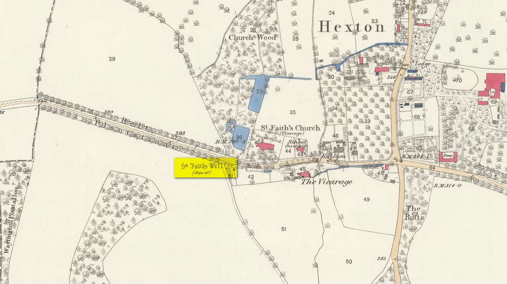 The site of the well is now in the garden of a house on the south side of the B655 Barton Road in Hexton, south west of St Faith’s church. Prior to the Reformation, there was a small chapel of St Faith adjacent to the well containing a shrine to the saint, which was, with the well a place of pilgrimage.