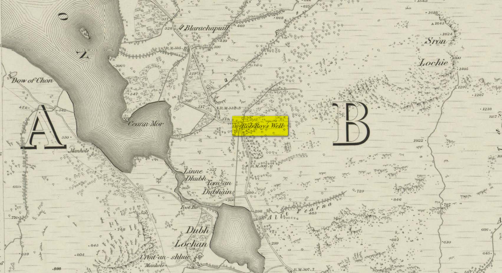 This long-forgotten site was found just by the old roadside several miles northwest of Aberfoyle, up the B829 Loch Chon road. Shown on the first Ordnance Survey map of the area in 1866, subsequent visits showed no remains of it and we must assume it had fallen back to Earth. When we visited the place recently, although there were no remains of any water trough, the spot where the well was shown on the map was very boggy with a small trickle of water running out of the slope. There is the possibility that, if the soaked soil just above the trickling water was excavated a few feet into the ground, that the original spring might be retrievable.