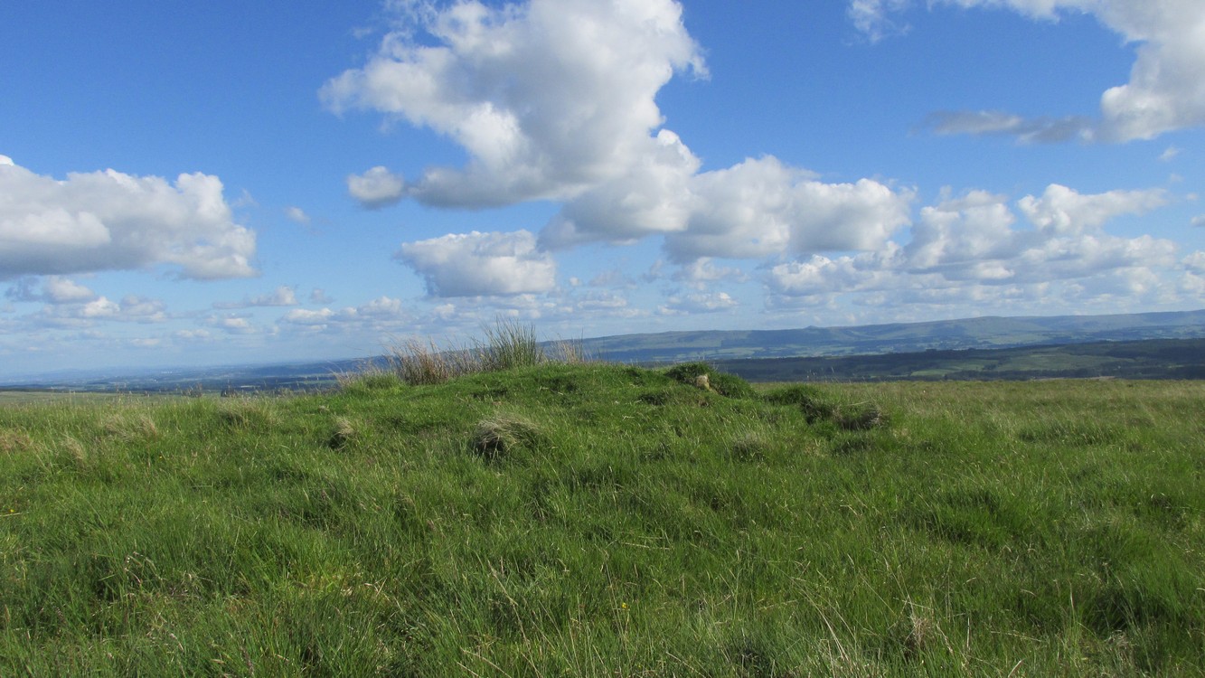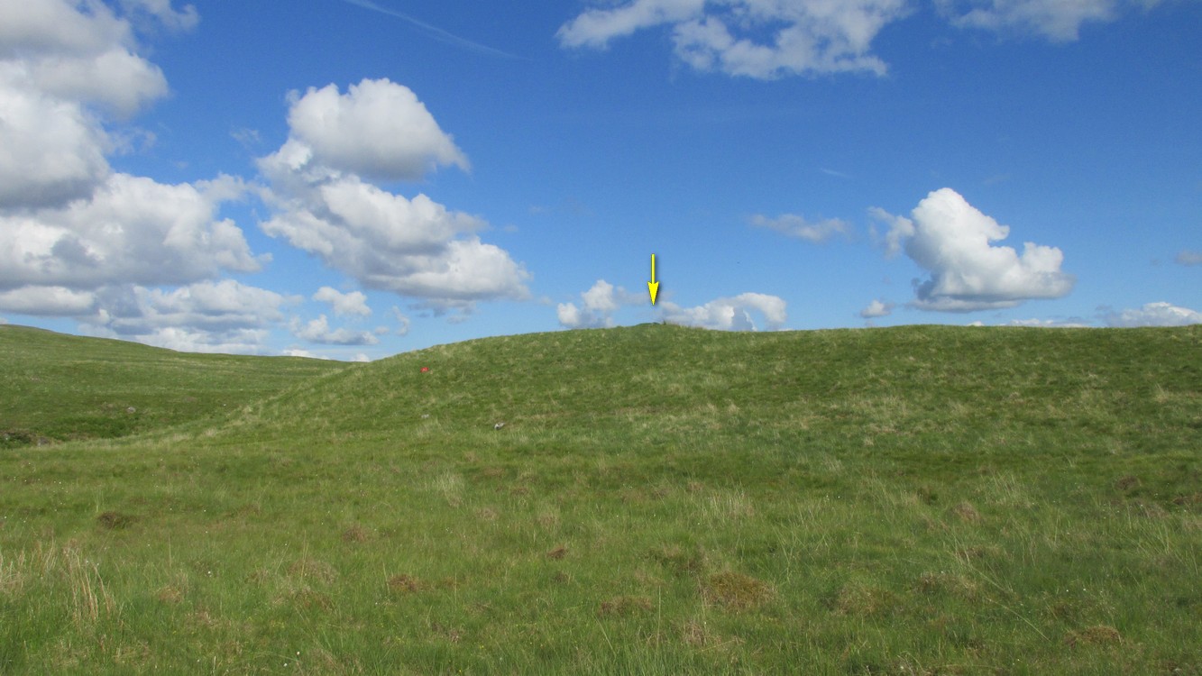 This is a helluva long way to walk to find such a small site, but the landscape makes it all the worthwhile. So… From Callander, head up the Bracklinn Falls road, going past the car-park there and on for 1½ miles, watching for the track on your left where you park-up. Walk down the track, over the river, then uphill until another track veers to your left. Follow this for nearly a mile until meeting another track that veers right. 4-500 yards along, on the same side as the burn on your left, the hill slopes up where a small grassy mound sits on its ridge. That’s it.