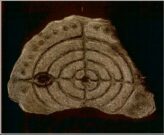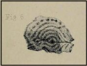 “Sometime ago Mr Tate, of Alnwick, discovered in the garden of Mr Matthewson at Jedburgh a stone cut with concentric circles, possibly a sepulchral cist, but peculiar in some respects. The stone is roundish, but broken off at one side, and about eighteen inches broad. Its face is covered by five incised concentric rings, and through the central cup pass at right angles two straight lines, which completely bisect all the circles. The outermost circle is about fourteen inches in diameter. Some inches to the left of the central cup is a second, with one incised circle around it. Arranged circularly outside of the outermost circle is a series or ring of points or stars, each cut out—so Dr Falla writes me—”as with a single stroke of a pick, rather than hewn out.” I am indebted to the same gentleman for the sketch of this stone.”