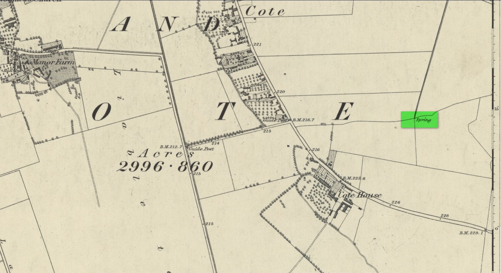 If we go 400 yards northeast across the field on the other side of the road from Cote House, a “Spring” that was shown on the early OS-maps would still seem to be actively feeding a dyke that runs roughly north from here. This is probably the holy well that was described in those Court Roll records—and it still seems to exist.
