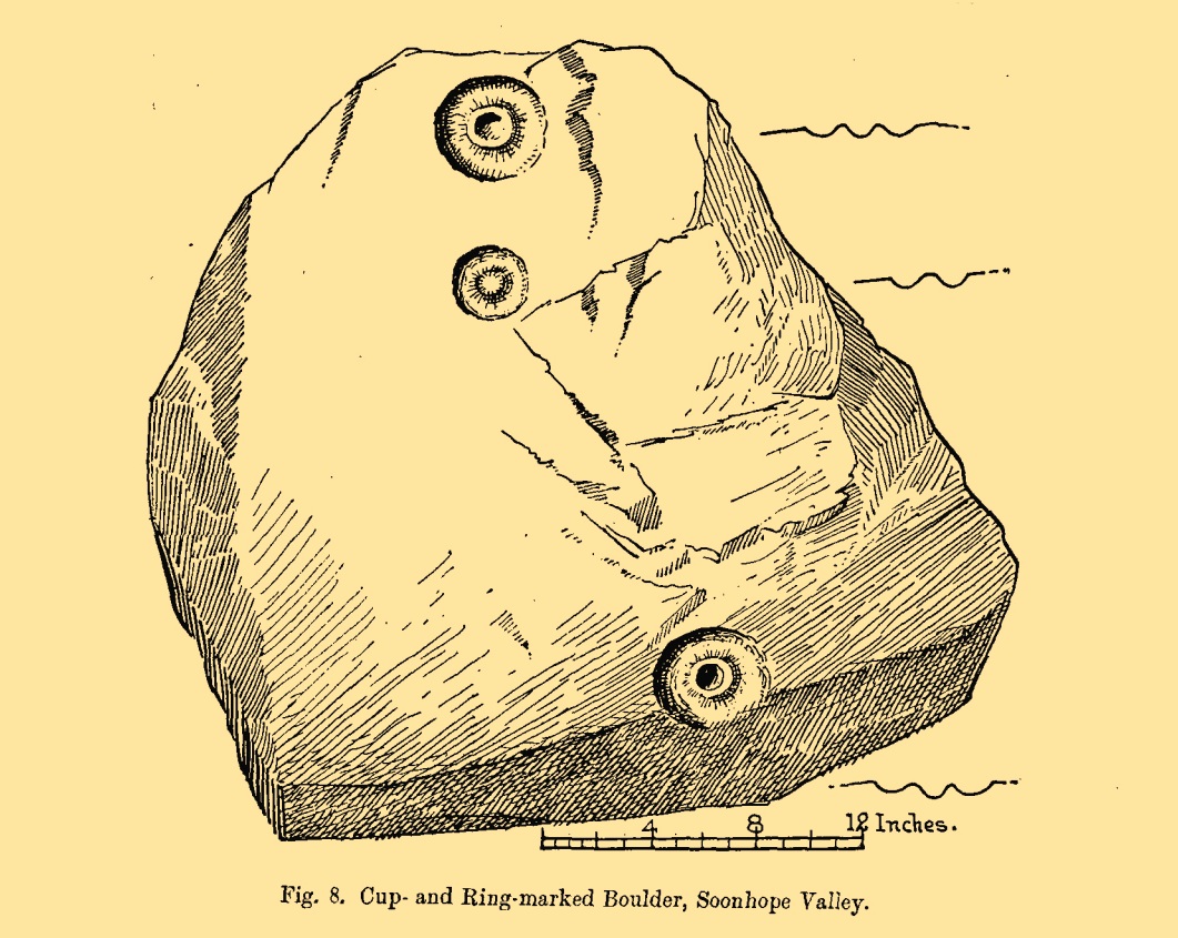 “A very little over one mile and a quarter up the valley, measuring from the road at Kerfield Cottage, a tiny rivulet called Kittlegairy Burn trickles down from the SE into the main stream. On the hill to its east, and about 450 feet higher, are the remains of a fort, one of a series of three crowning prominent heights along this side of the valley. Down the main stream from Kittlegairy Burn is a large ruined sheep-shelter called Soonhope. Nearly midway between these two points a deep curve has been hollowed out of the E. bank; and, at the foot of this rather high gravel bank, half immersed in the stream, lies the block of stone with the cup-and ring-marks. They were discovered, 14th September 1896, by my daughter, Helen, on crossing the stream; and we at once proceeded to make a measured drawing, a reproduction of which is given here…. The depth of the rings in proportion to their width is the one most noticeable feature; next, the extreme thinness of the intervening ‘neck’; but, on a minute and careful examination of the nature of the stone itself, taking into consideration that its angularity and sharpness of edge and the absence of moss or even of confervoid growths on its surfaces went against the possibility of its being truly waterworn.”