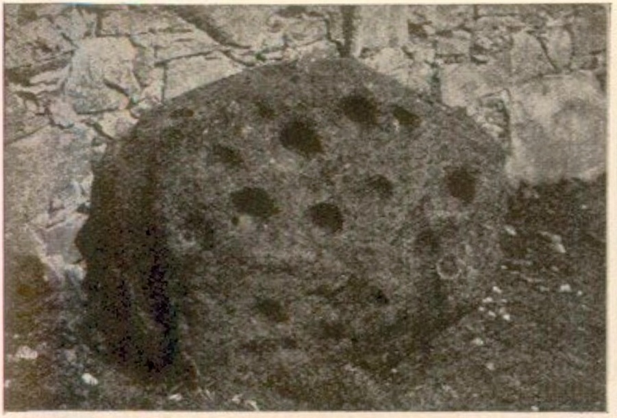 “The stone…has nineteen cups all on the same face.  The largest cup is 3¾ inches in diameter and 2 inches deep.  The next largest has the same diameter, but is 1½ inch deep.  Other five of the cups are very nearly the same size.  The smallest cup is 1¾ inch in diameter and ½ inch deep, but weathering has effected much towards almost obliterating some of the smaller cups.  The stone is of whinstone with slight veins of quartz.  It is oval in form and varies in thickness from 2½ inches to 4 inches.  Its greatest diameter is 3 feet 2 inches, and its least diameter 2 feet 8 inches.”