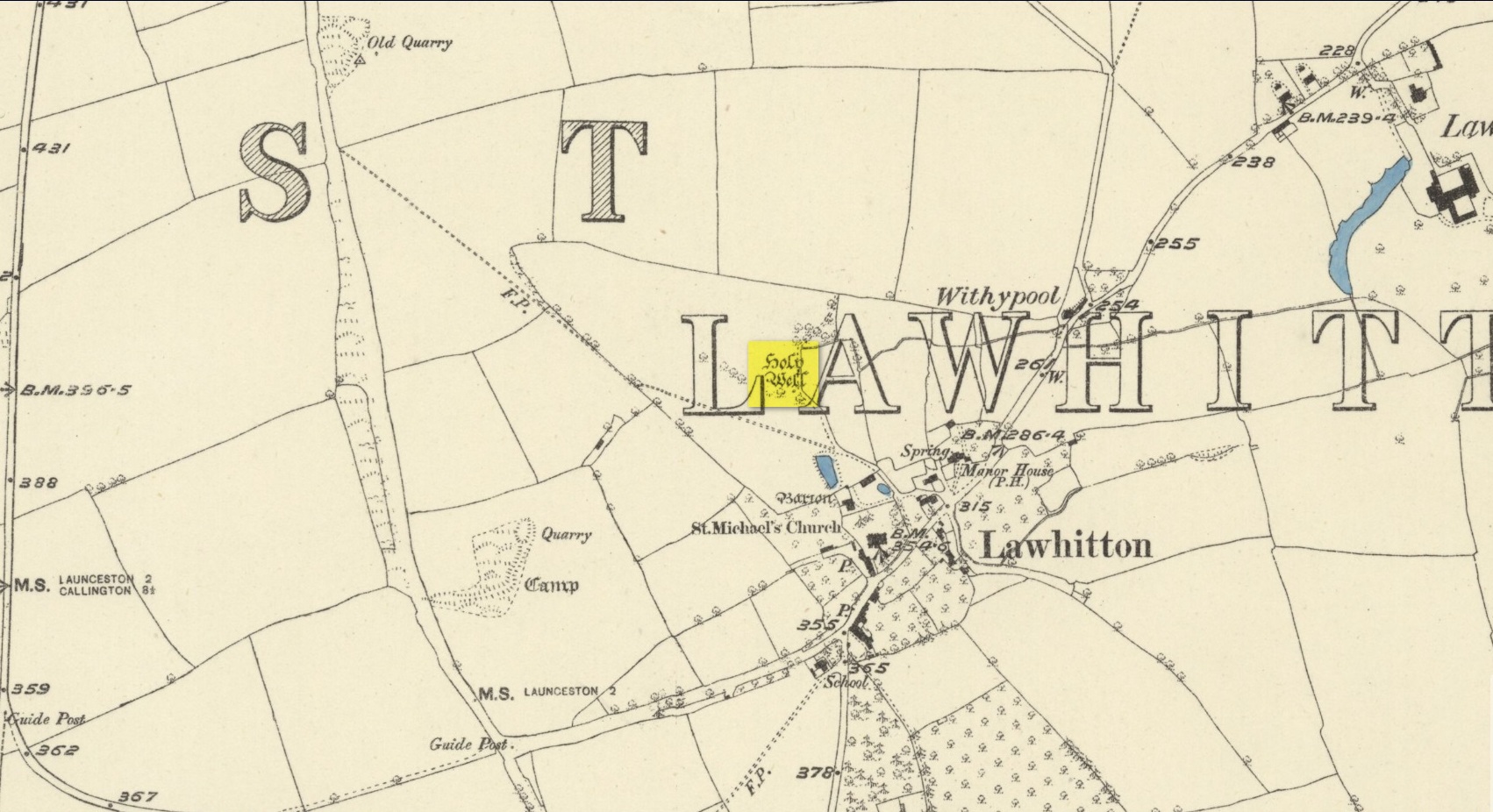 Highlighted on the 1882 OS-map several hundred yards north of St. Michael’s church, this site seems to have fallen back to Earth as no remains of it have been found in recent visits. It was described in Charles Henderson’s (1914) notes as the “holy well at Barton Farm”, and was visited by J. Meyrick (1982) in April of 1980, who told that it could be found by taking “the track immediately east of Lawhitton church which runs through the farm of Mr Lancaster… After going through the yard proceed ¼ mile down track to the valley where you reach a stream and the Well is on the right.” It was sought after by Cheryl Straffon (1998) but following her visit to find the Well she told that “there was nothing now to see except a kind of natural basin by the small bridge.”