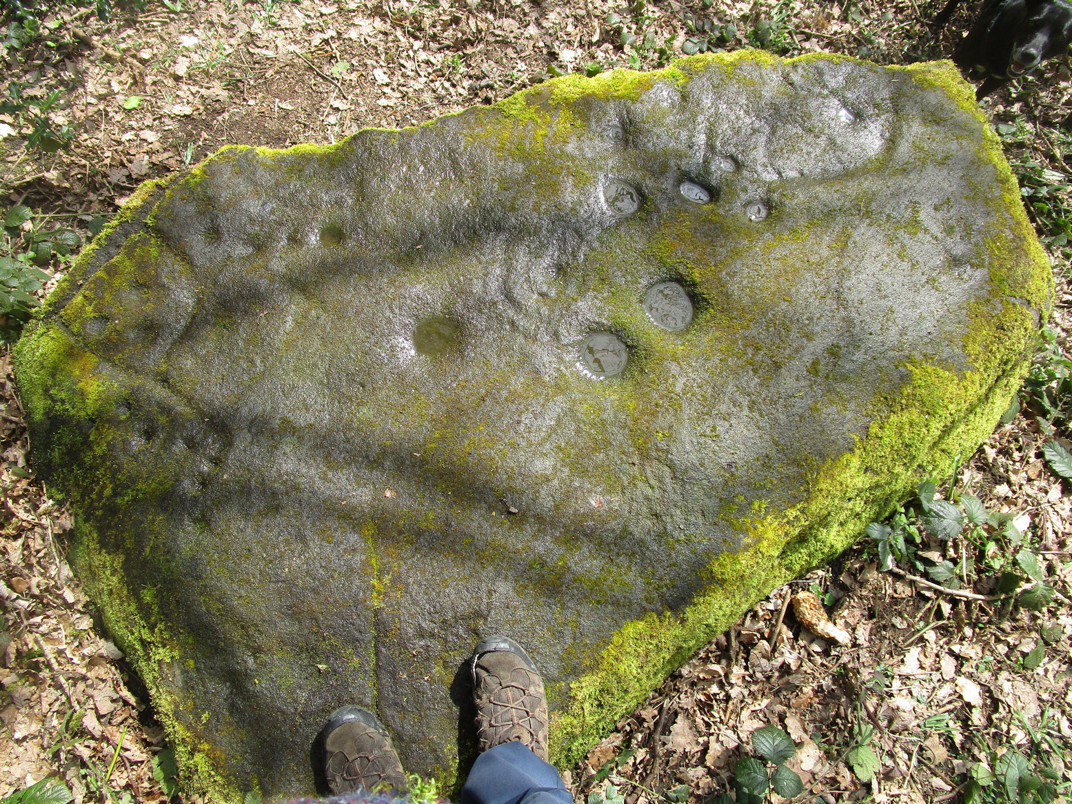 More obvious (apart from the deep “cups”), and the first thing you notice as you approach the stone, are the later and much more well-defined elements on the east side of the stone: a curious wave-form writhes from the edge of the rock across its smooth surface, beneath which we find a cup-and-ring and a number of single cup-marks, some enclosed inside a rounded box, with others sat between the curved carved line and the stone’s edge. The “rounded box” with its three cups at first seems to be on its own, but as the light changes you’ll notice a much fainter (possibly older) rectangular box attached to it; no cups are visible inside this.