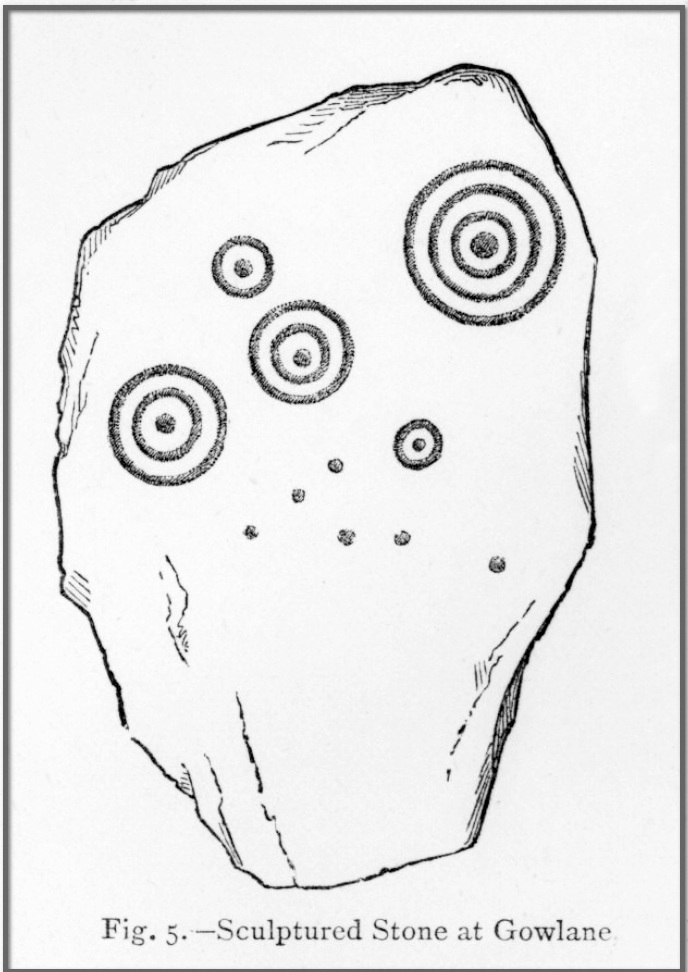 This is one of three carvings illustrated in James Graves’ (1877) essay on Irish petroglyphs that were first discovered by a Mr Hitchcock in 1848, but which hasn’t been seen since. Graves described the impressive Aghacarrible carving and then told how, “in the neighbouring townland of Gowlane” this and other petroglyphs existed. A series of multiple cup-and-rings and some lines of cup-marks are clearly illustrated on Hitchcock’s fine sketch, but no detailed notes were ever made of the place. It’s presumed that this carving is on an earthfast rock, as the other two others were broken pieces from what he said was a “larger monument.”