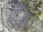 “Striated, pitted bedrock with crack down centre, in grass and amongst other rocks and bedrock. Carving, centre and W end: enclosure type angular grooves and two cups.”