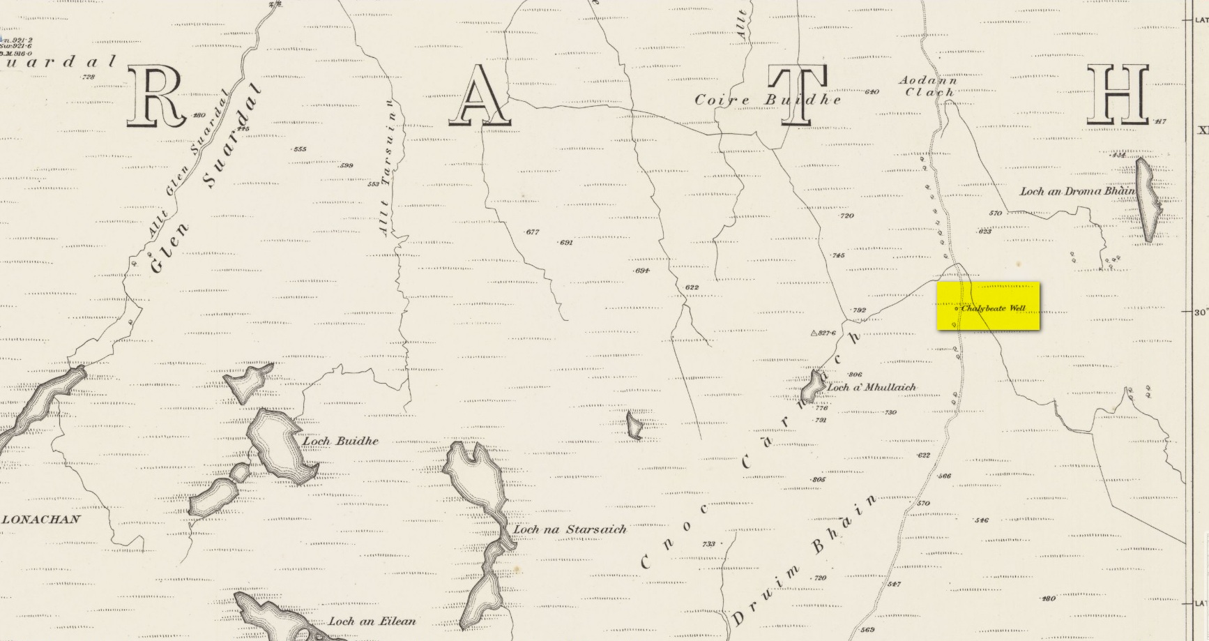Highlighted on the earliest Ordnance Survey maps of the island, roughly halfway along the Broadford to Heaste road on the right (west) side you will come across the Tabar Ruadh (Gaelic for “Red Well”). For many generations at this point was a Chalybeate well where villagers would stop and drink in a pewter mug from outlet of cast iron pipe which connected to the stone well some nine feet from the road. It was a major stopping point for their horses and ponies to take a drink too.
