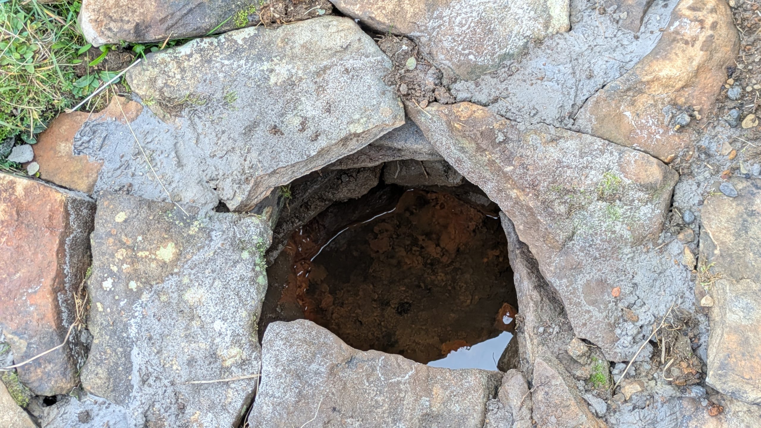 For the last fifteen years I have been walking this road and had made it a determination to find this well. Success this summer! — and the hidden overgrown well was cleaned out a new steel pipe added. Chalybeate water now flows and a wooden box is at the roadside with a tin mug. On a wet roadside ditch this red water is very obvious where it joins the road.