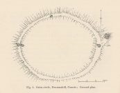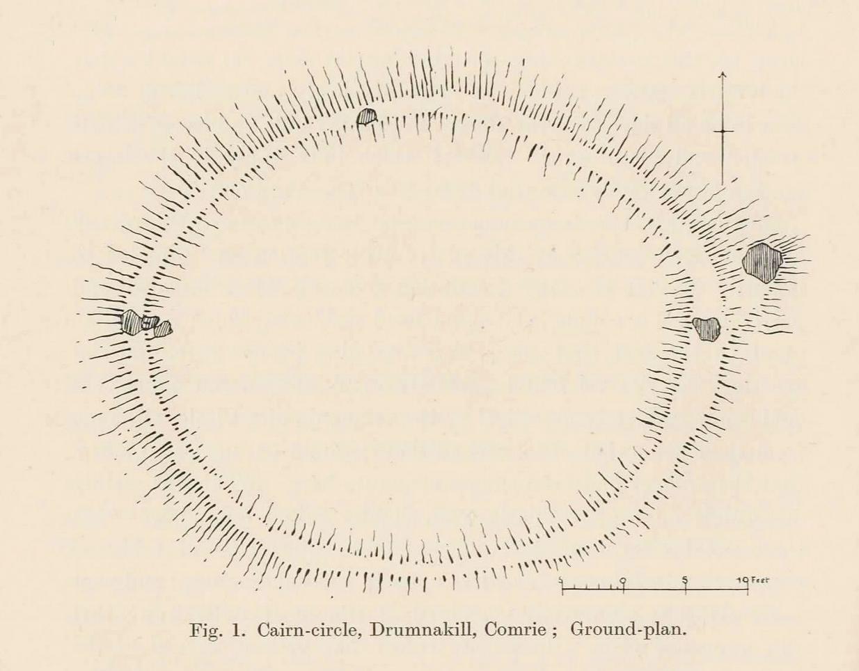 “This Cairn-circle is about seventy yards east of the shepherd’s cottage, and it slightly resembles others already noticed in Perthshire.  It measures from crest to crest of its circular ridge 44 feet 3 inches east and west by 37 feet 10 inches north and south.  Several large blocks of stone lie exposed on the crest, and many others can be felt as one walks along it.  The ridge is completely  oval-circular, having no break or passage-way, and encloses a flattish, rather uneven space measuring about 34 feet in diameter.  The height above the outside ground at the best-preserved portions is fully 4 feet.”