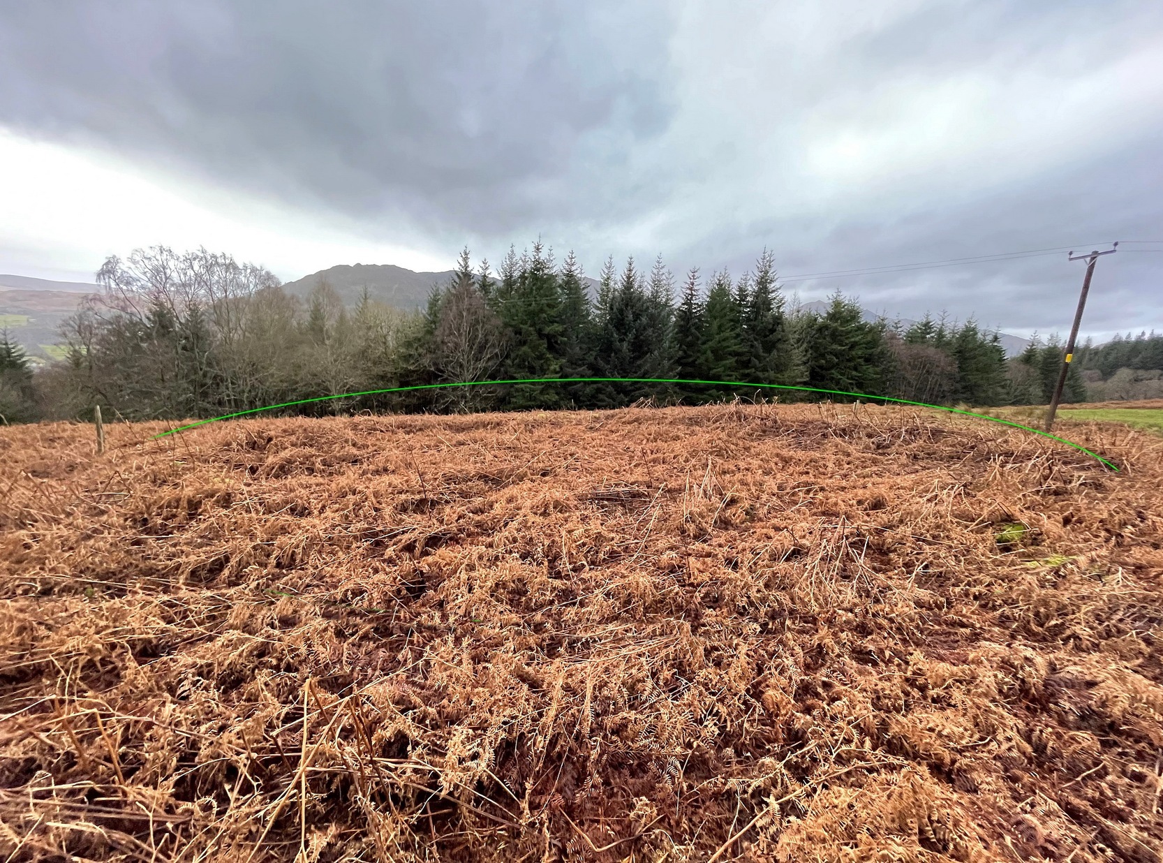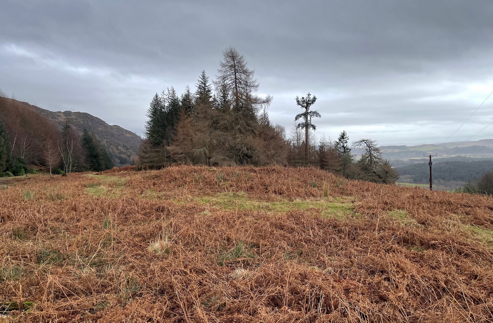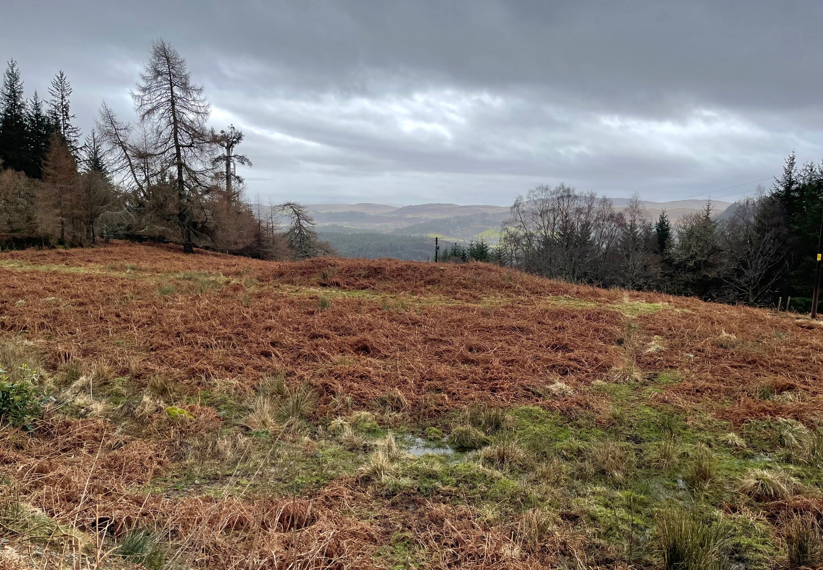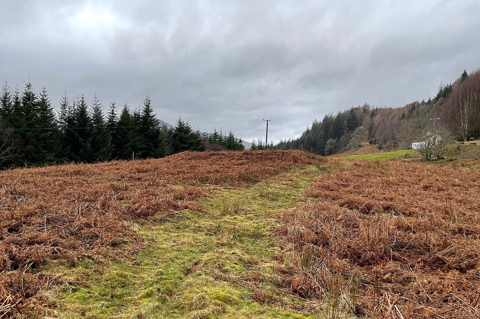 Along the A85 road between Comrie and St Fillans, just over a mile out of Comrie, on the right-hand side (north) of the road is the small farm-track into the fields where the ruined stone circle of Tullybannocher lives.  Walk up this track (known as Maam Road), past the stones, and keep going uphill for more than a mile (literally 1 mile up, another track turns sheer right, but ignore it) where the track eventually levels-out; keep walking for another 600 yards, slightly downhill, until you reach a distinct fork in the track where you need to veer right, uphill, and keep walking up the track for ⅔-mile (1km) where you’ll see a cottage ahead of you.  About 50 yards before the house, down the slope on your left, a large rounded mass covered in bracken is the site you’re after.