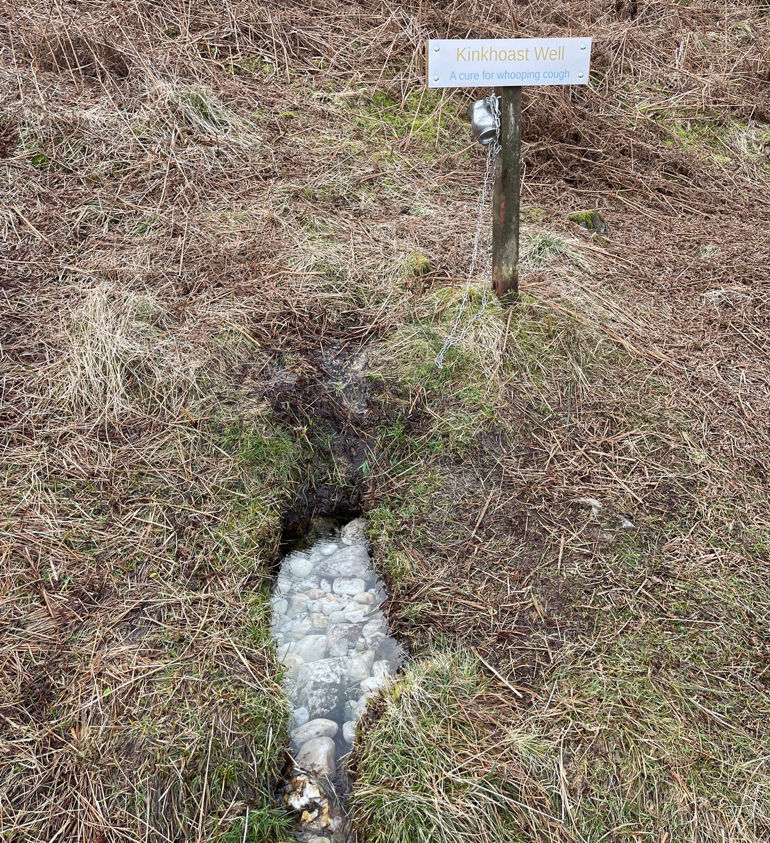 The name Kinkhoast itself (and variables thereof) is a Scottish dialect word, found from Galloway and into the Highlands.  Jamieson (1880) describes it as literally “hooping cough”, with a brief note on the disease being cured by water drank from a shell.  Meanwhile, in Grant & Morison’s (1960) massive work, they give numerous examples of the term, most of which relate to the same “whooping cough”, with some examples of folk remedies to abate the disease, including one of parents sending their children to take a drink from the “Kinker Steen Wall”—in that case from the parish of Logie.  Examples of the very same tradition are known at other kinkhost sites.  Check the place out when you’re in the area—and rest for a while to drink in the beautiful views…