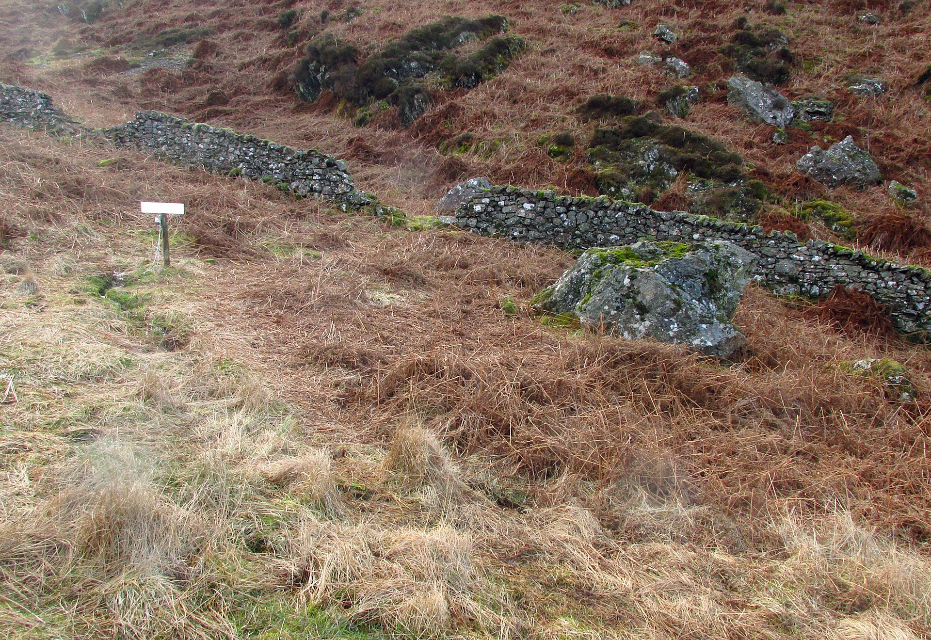 From Comrie village, take the long winding steep road up past the Devil’s Cauldron towards Glen Lednock.  After 1½ miles the road begins to level-out and you come out from the trees and about 400 yards along there’s a dirt-track on your left.  Park here!  OK, now walk further along the road (not the dirt-track) for less than 100 yards and take the footpath up the slope (if this is blocked—it shouldn’t be!—you can walk further along until your reach the next track on your left).  Go up this footpath for 200 yards till you reach the track by the large bend; and then walk up it for another 200 yards where there’s another large bend.  On your right, past the solitary big rock, you’ll see the sign…