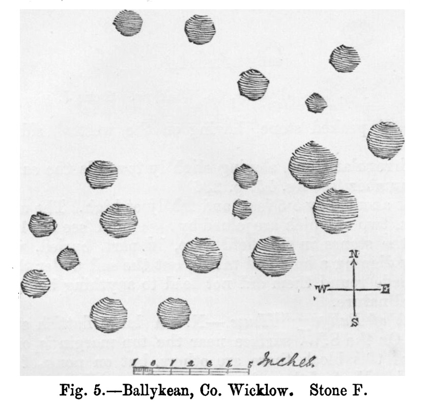 This is one of at least fourteen petroglyphs in this parish that have been either lost or destroyed since their initial description in the 19th century. It was described in George Kinihan’s (1884) survey as being, “a slightly dome-shaped stone, its surface being nearly level with that of the ground. The cups are both numerous and deep…although bits of the surface have been flaked off by fire.” He took a rubbing of the stone which showed nineteen cup-marks on its upper surface. When the Archaeological Survey of Ireland looked for the carving in 1990 it could not be located; and when Christiaan Corlett (2014) described this and the other carvings in this cluster, he thought that a group of stones dumped “in a hollow area north of the field” might possibly be where it had been moved to—although no such carvings have been identified there.