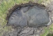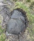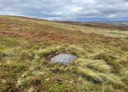 I came across this very basic carving when checking out a couple of others close by and found that it hadn’t been recorded before. It’s nothing special to look at, but is an outlier of the main Craig Hill cluster of carvings a few hundred yards to the west.  The design consists of at least two cup-marks that have been etched near the top of the rock, although when I wet the stone it seemed as if a third one was next to the other two, as if in a line.  The sun was at its peak when I found it, which meant that I couldn’t get any decent photographs to illustrate this—even when I watered the olde thing!  It’s another carving that will only be of interest to the real petroglyph fanatics amongst you.