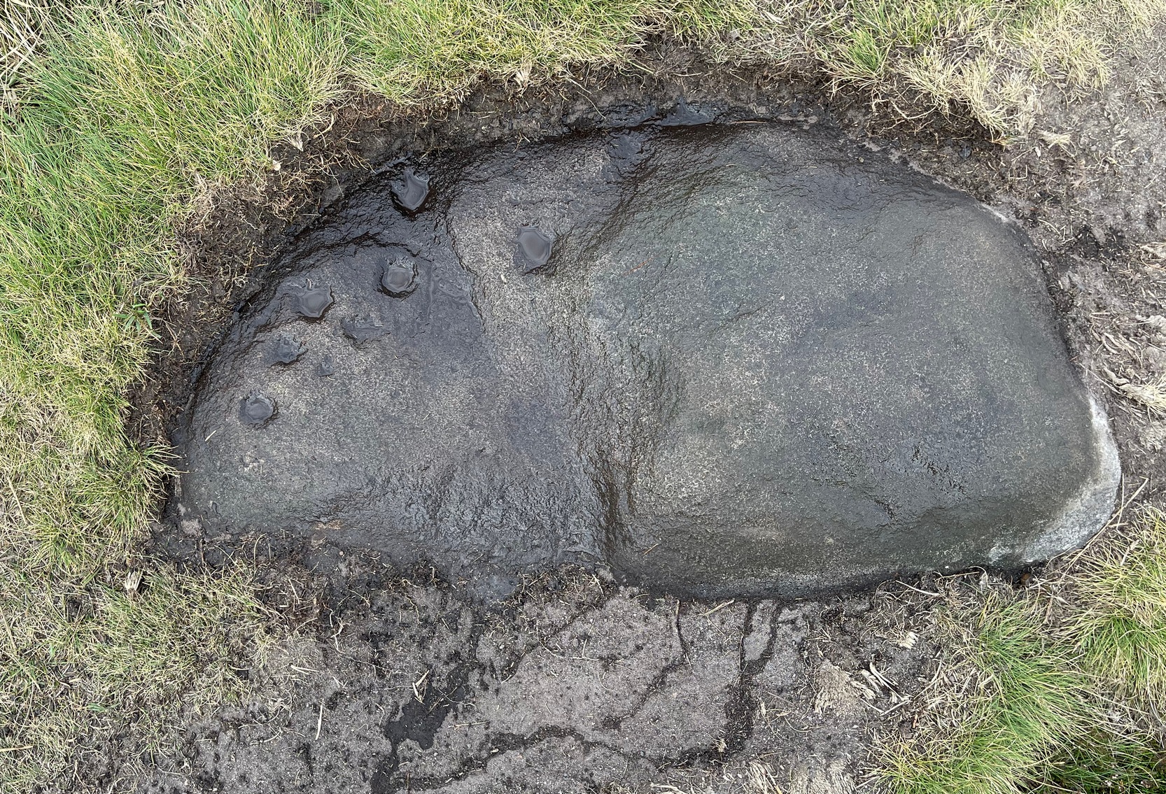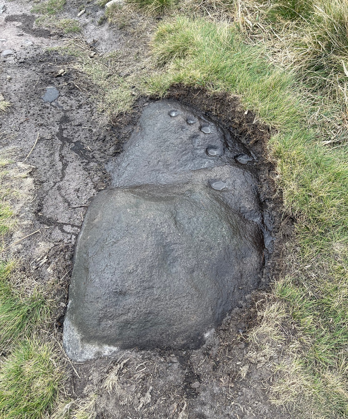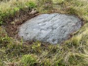 This cup-marked stone was first unearthed by fellow rock art explorers Mike Short and Dave Spencer in 2012 after they’d been looking at some of the other carvings hereby.  In peeling back the turf on the stone, otherwise hidden cups—perhaps nine in all—were uncovered that had been hidden for centuries.  Most of them are quite distinct, but it seems that a couple of the cups may have been left unfinished, as their size isn’t consistent with the others on this and other carvings close by.