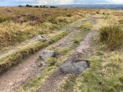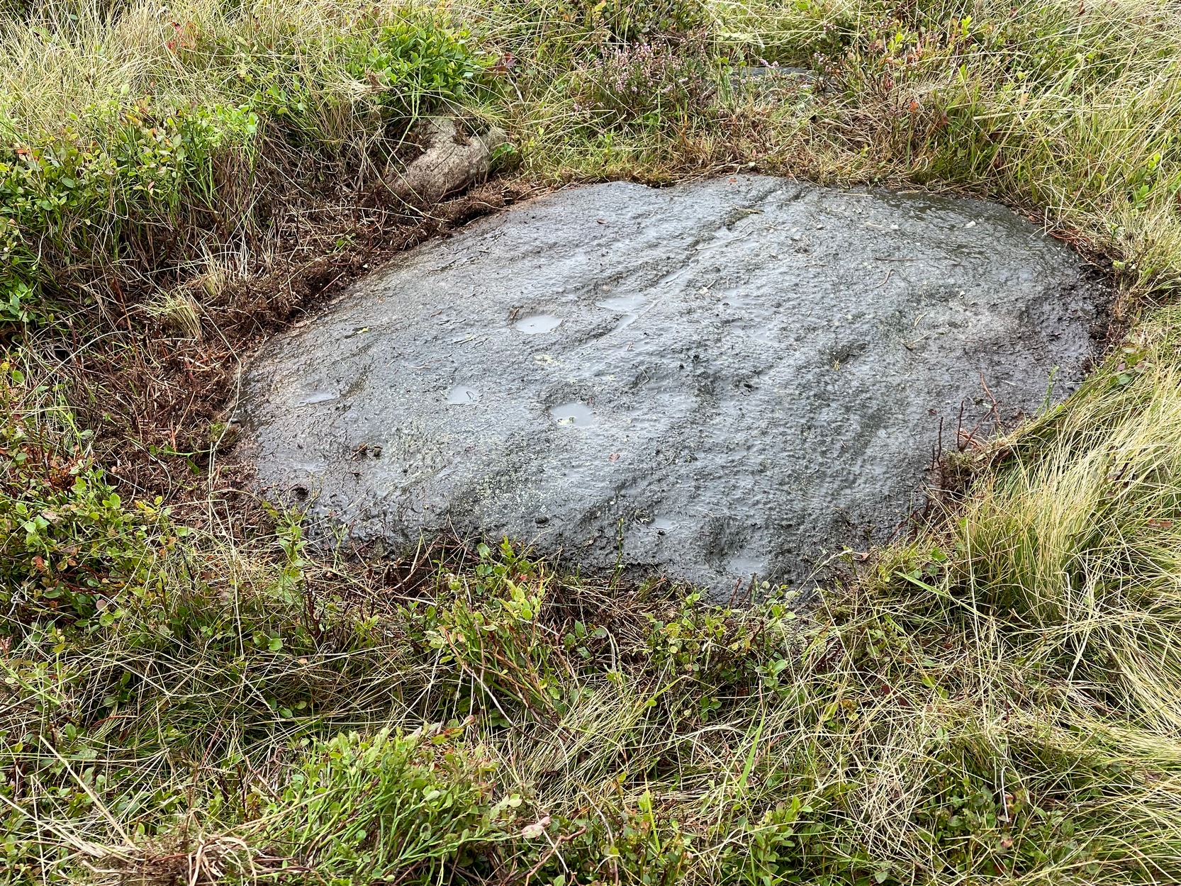 The carved stone—located on the northern edge of the Low Plain prehistoric cemetery—is one in a line of several low earthfast rocks that crosses the track hereby and it’s possible that it was part of some prehistoric walling.  Linear remains of walls and ditches were reported here in the 19th century and some of them can still be seen in some places on this part of the hill, but much of it has been destroyed.