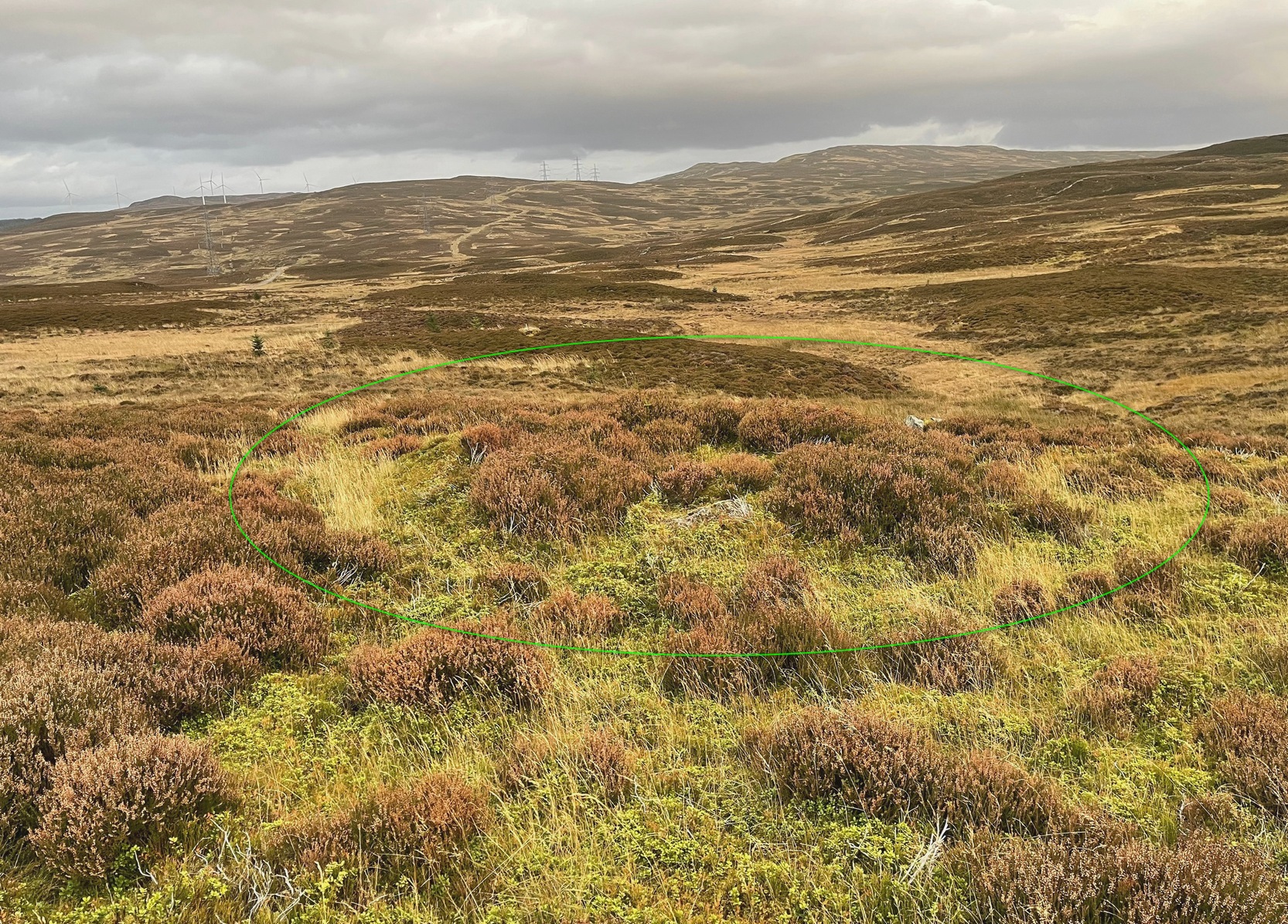 Take the long steep zigzag road from Kenmore to Amulree, and just where the road begins to level out, park up near the isolated hut by the roadside at the side of the lochan.  Just past here, a track on your left takes you onto the moors, past the lochan.  Nearly a mile along the track splits: bear to the right, uphill slightly, then it’ll wind downhill and you’ll pass another track on your right. Ignore it, keep walking along and where you find a grassy little passing-place on your right—stop!  Now walk uphill, onto the moor, through the heather for 175 yards and the land has levelled out.  Look around!