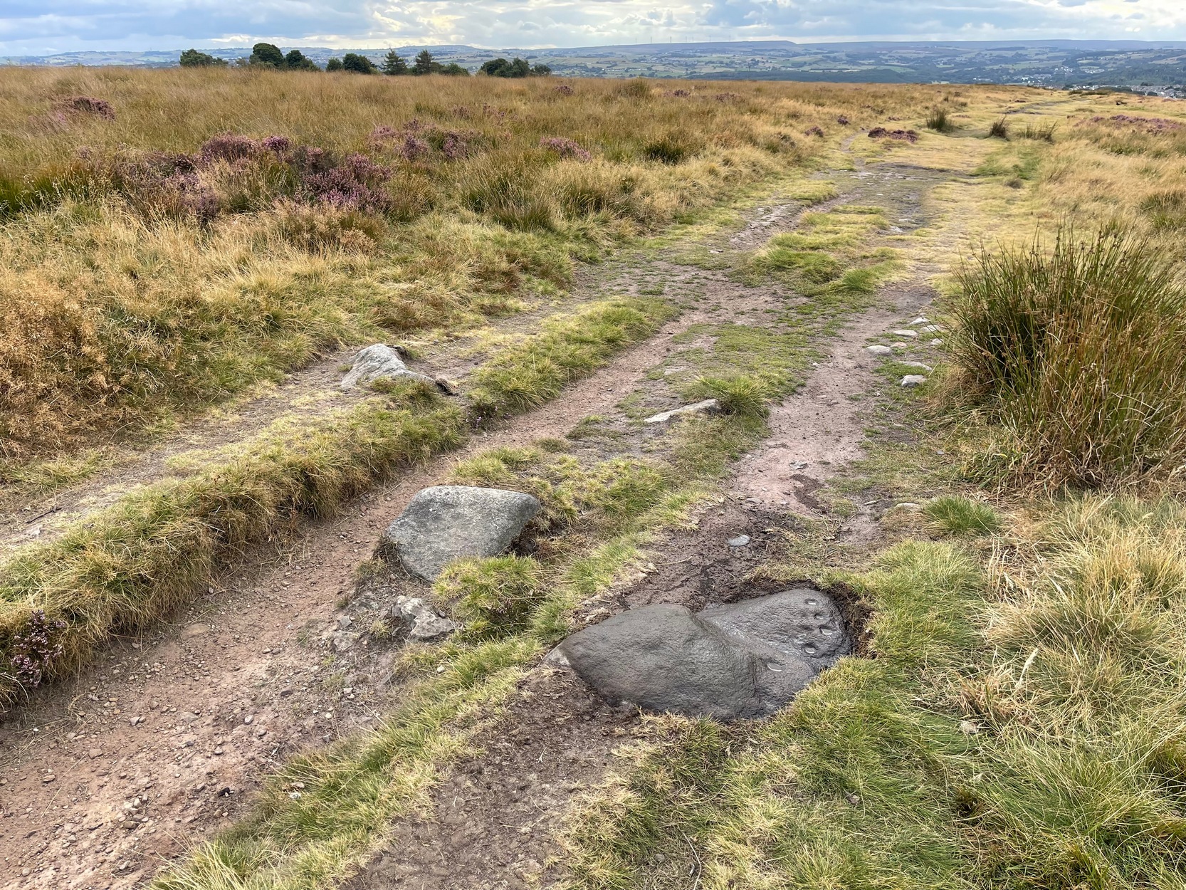 The view from here is quite something: gazing east to the heathen hilltop of Otley Chevin (Beltane rites and rock art — albeit not much), north-east to the far uplands of the White Horse of Kilburn, then across the northern panoramas of Askwith and Denton Moors, and beyond.  Some archaeologists have started to believe that such vistas may have had relevance with such carvings, sometimes.  They’ve caught up at last! 🙂  Anyhow, the carving itself is pretty simplistic and probably only of interest to the real petroglyph nuts amongst you – although it’s mebbe worth checking out if you’re visiting the Great Skirtful giant cairn and its very impressive hengi-form neighbour.