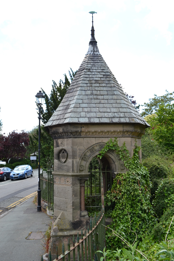 Whatever the origin, when the garden was developed in the 1860s by the 2nd Earl of Westminster, Richard Grosvenor, a rather grand and impressive red and buff sandstone ashlar well house was erected. This was designed by John Douglas, a local Chester architect, who was not forthcoming in making this well grand with canted corners, pointed arches flanked by a granite columns with wrought iron bars. At each corner is a small carved circle containing carved sheafs and portcullis and the voussoirs contain carved roses. A tiled spired roof sits upon the structure with an apex surmounted by a copper fish weathervane. All in all, rather ostentatious for a well – especially as access to the well chamber has not been made very easy by the enclosure. Whether the improvements were done to develop some sort of spa well is unclear, but it is known that the when Canniff Haight (1904) visited for his United Empire, the spring was still flowing and noted, for he records: