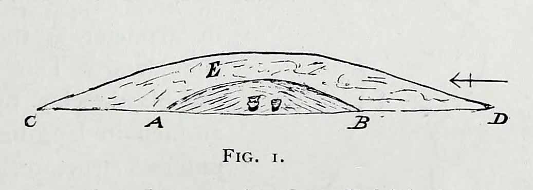 “The upper portion E, to a depth of 16 inches, consisted chiefly of the surface soil of the neighbourhood, the bottom part of which was reddened as if by the action of fire. Close below this was a stratum of wood and ashes and other dark matter, 2-3 inches in thickness; and then a lenticular bed of tough drab-coloured clay, 29 feet in diameter, and 12-14 inches thick in the centre, gradually thinning towards the circumference. The upper part of this bed of clay, which was in contact with the stratum of wood ashes, was reddened by fire; its under surface had a similar appearance and rested upon what seemed to be a second stratum of burnt and decayed matter, 2-3 inches in thickness, similar to that already described. The clay forming this lenticular bed contained numerous small fragments of grey flint, characteristic of the chalk of the neighbourhood. It must have been obtained from one of the valley bottoms (either Burdale, Wharram-le-Street or Duggleby), in which are exposures of the Kimeridge clay. In these places, angular pieces of flint and chalk crumble from the hillside, and mix with the clay, imparting a greyish colour to it. This is especially the case at Burdale, where there is a fine spring at the base of the chalk, and a small pond resting on the Kimeridge; and it is probably from this place that most of the clay for the construction of this barrow was obtained. It is not easy to explain the method by which the clay was transported, but several tons had evidently been used in this case. Many other instances in which material from a distance has been used in the erection of the barrows of this neighbourhood are recorded in (the Yorkshire Wolds).