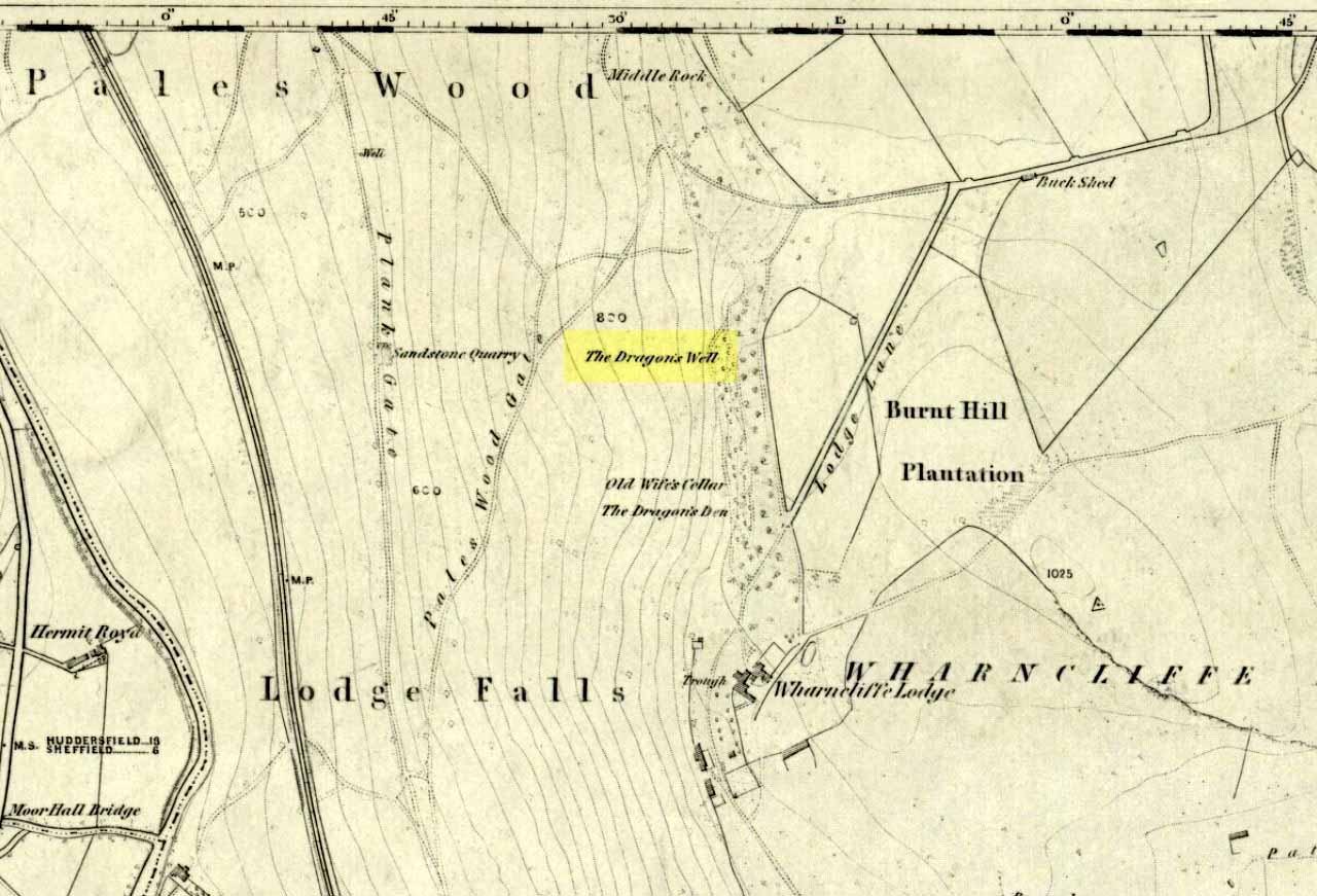 Highlighted on the first OS-map of the area in 1855—along with it’s home and an associated site of the Cailleach, or Old Wife’s Cellar close by—the famous Wharncliffe Dragon used to drink from here, moreso than the other Dragon’s Well at Bolsterstone more than a mile to the west. The dragon – with its “seven heads and twice seven eyes” – lived a short distant away on the rocks above, at the Dragon’s Den. The description of this great beast and its antics at the well were summed-up in Rob Wilson’s book on the Holy Wells of South Yorkshire (1991). He told that: