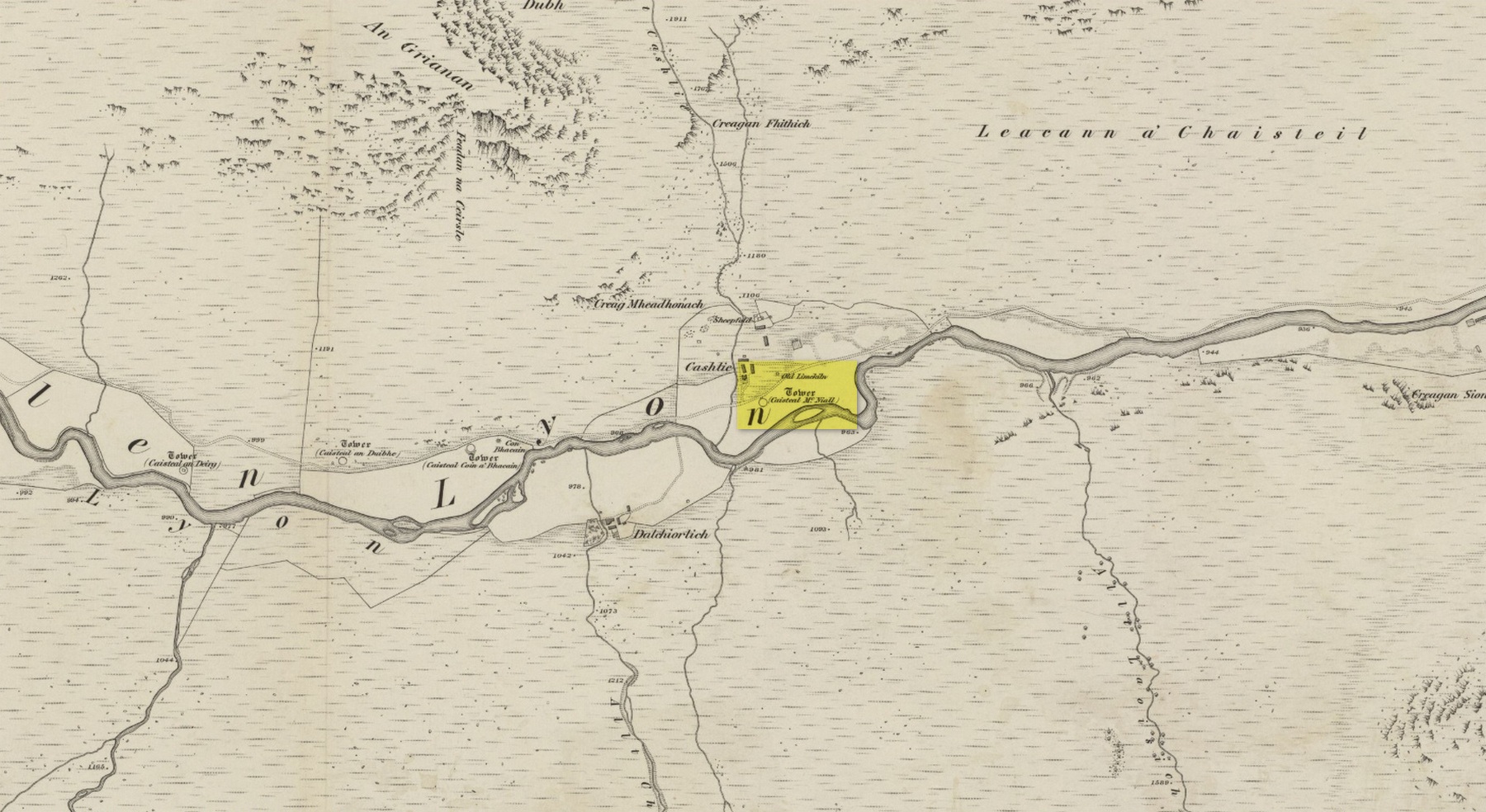 “The fourth of the Cashlie towers is a few yards south of the road, right in front of Cashlie farmhouse, now a shooting lodge.  Though a quantity of large stones marks the site, the structure has been so badly knocked about that we found it impossible to take measurements sufficient for a plan. It was, however, apparently not circular, but rather oval. Its walls appeared to vary from about 9 feet to 12 feet 6 inches in thickness.”