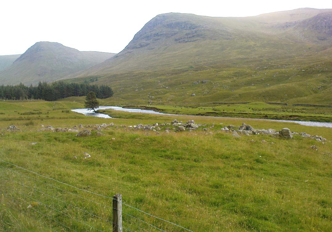 Truly remote, but easy to find once you’re nearing the western end of Glen Lyon. Going upstream, past Cashlie Dam, watch out for the well-preserved stone kiln on the left-hand side of the road, just before Cashlie house.  50 yards or further along, cross the road and in the field by the riverside, the circular mass of stones sorta gives the game away.