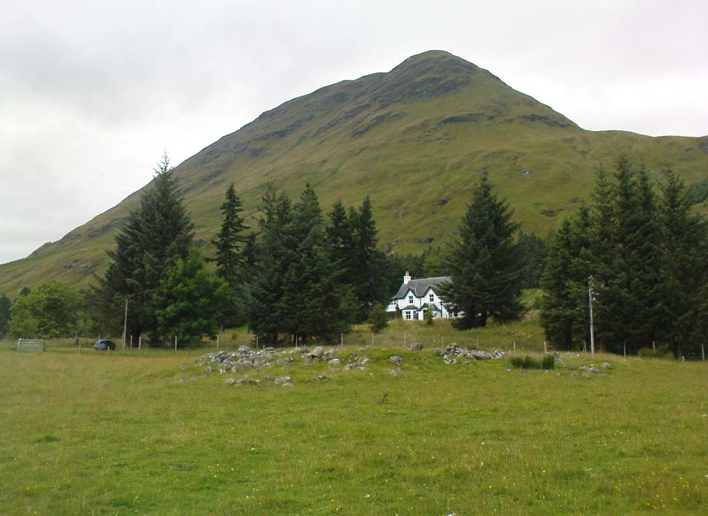 Shown on modern OS-maps as a ‘homestead’ and described variously by archaeologists and historians as a fort or a round-house, this is just one example of around twenty large prehistoric constructions that scatter the stunning mountainous Glen Lyon region which legend tells were the forts of the great hero-figure, Finn.  Three other constructions of the same nature are found just a few hundred yards further up the Glen from here.  Each is of roughly the same age and nature by the look of things.  Their walls are extremely wide and made up of very large rocks, which would have taken huge efforts to construct.