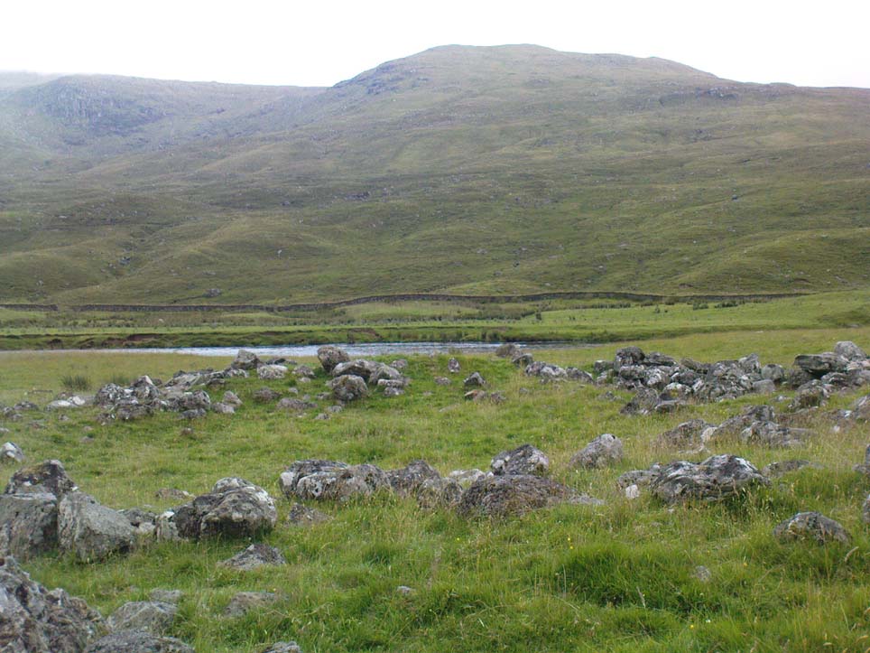 From Bettyhill village, take the A836 road east (as if you’re heading towards Thurso) for literally 1½ miles (2.4km) and take the left turn to Farr (signposted).  Exactly a mile along, just past the gated house above the road on your right, in the sloping field below it, you’ll notice a seemingly innocuous scatter of stones doing nothing in particular in the grassland.  That’s it!
