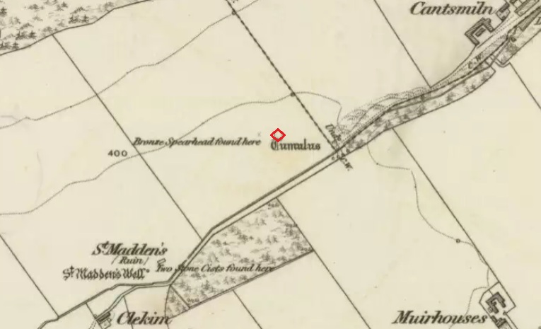 The Ordnance Survey Name Books, and the 25-inch OS map of 1865 record the finding, 20 yards to the west of the knowe, of a bronze spear head, which was at that time in the possession of a Mr Dixon, a merchant of Kirriemuir, which may go some way to explaining the alternative name of the site as ‘Battle Cairn’. The Name Books further record the testimony of a William Duncan that, ‘there have been 7 or 8 stone coffins and an urn found in the knowe, and that he believes a number more might be found if sought for, as the half of it is not yet excavated‘.