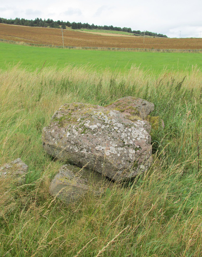 Andrew Jervise, writing of the site in 1864 described it as having been 300′ in circumference and 6-7′ high before the owner started to remove it for agricultural ‘improvements’ around 1859. He described it as being sometimes known as the ‘Battle Cairn’. As part of the demolition of the mound, agricultural workers in October 1859 unearthed a large cinerary urn half filled with human bones and protected by a large sandstone flag. Jervise writes: