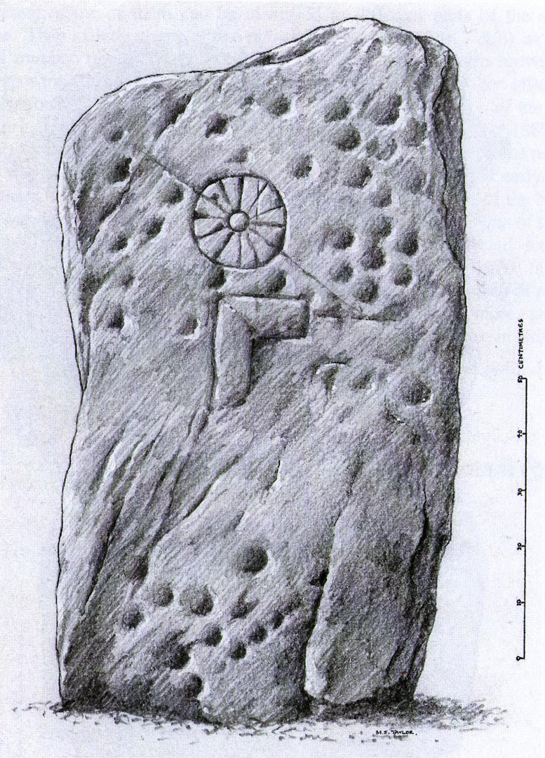 An intriguing stone with what may be a long and fascinating history behind it… It was only rediscovered in the 1960s, when the farmer at Ardjachie (2½ miles northwest of Tain town centre) came across it in one of his fields. It’s not large or notable in any way, other than it possessing a couple of really peculiar symbols etched amongst a mass of otherwise standard neolithic and Bronze Age cup-marks. These other symbols are (as seen in Mark Taylor’s drawing, right) a very distinct ‘spoked wheel’ and what looks like a right-angled ‘tool’ or set-square of some sort. These symbols have brought with them notions from academics who are claim it has Pictish provenance. However, we must be very cautious of this idea….