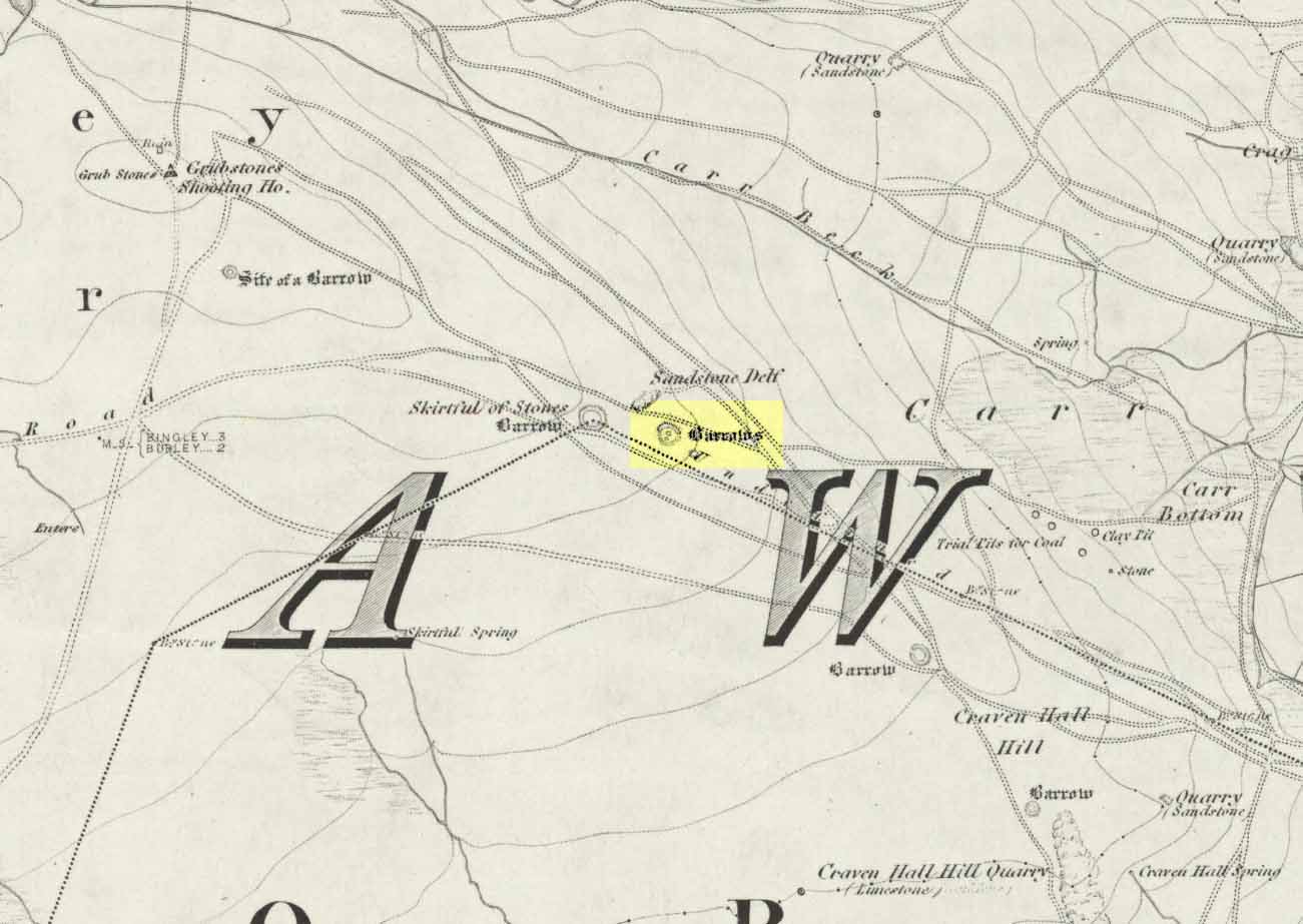 Using the OS-map as a guide, from Denton village head up the road northwest, past Moorside Farm and onto the moor. Before you reach the rise of Lippersley Pike you’ll reach the Crow Well itself (completely covered over by Yorkshire Water’s handiwork, stopping anyone from drinking the previously fresh waters here). In the middle of nowhere, just above the completely ruined well, is the old shooter’s cottage and from here, Eric Cowling (1946) told us to look in the heather immediately east. When Richard Stroud and I ventured here a few years back (2.8.5) we couldn’t find a thing — though a vaguely reminiscent structure seemed possible 300 yards away.