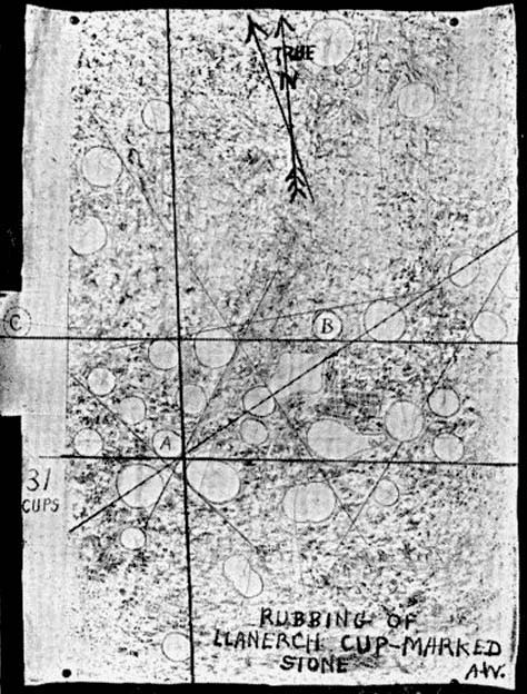 “I also (as soon as I got home) tested for alignments, and inked in those of four cups which I found, as I considered lines of three to be of no value as proof. I could not at that time see any tangible proof of anything, and put it down to this (broken) stone having probably been moved. The reproduction I give is of this crude rubbing exactly as I finished it (outlining then the rather indefinite edges of the cups) in 1928.”