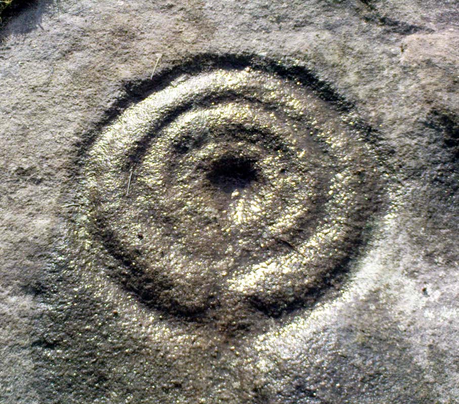 Cup-and-ring stones, petroglyphs, rock art: these are general terms used to describe ostensibly non-linear carved designs on outcrops of rock or solitary boulders. They are found in every continent on Earth. British examples originate from the neolithic period (some may be even older). Their central features are small rounded cup-markings, circles, semi-circles, curved lines (short, mid-length, and long), straight-ish lines, double- & multiple-rings, all in usually abstract design-forms. Their almost complete non-linear nature relate to non-egoic structures, making them difficult to intellectually grasp; and no two carvings are the same. Many carvings have a relationship with ancient notions of death & its mythic correlates. In animistic terms, they relate to the spirit of rocks and other features of the natural landscape. It is likely that some represent journeys (animal, tribal and personal); some represent events (ritual); some represent the heavens; some represent maps. The correct study of petroglyphs is via anthropology, archaeology, comparative religion, consciousness studies and myth.