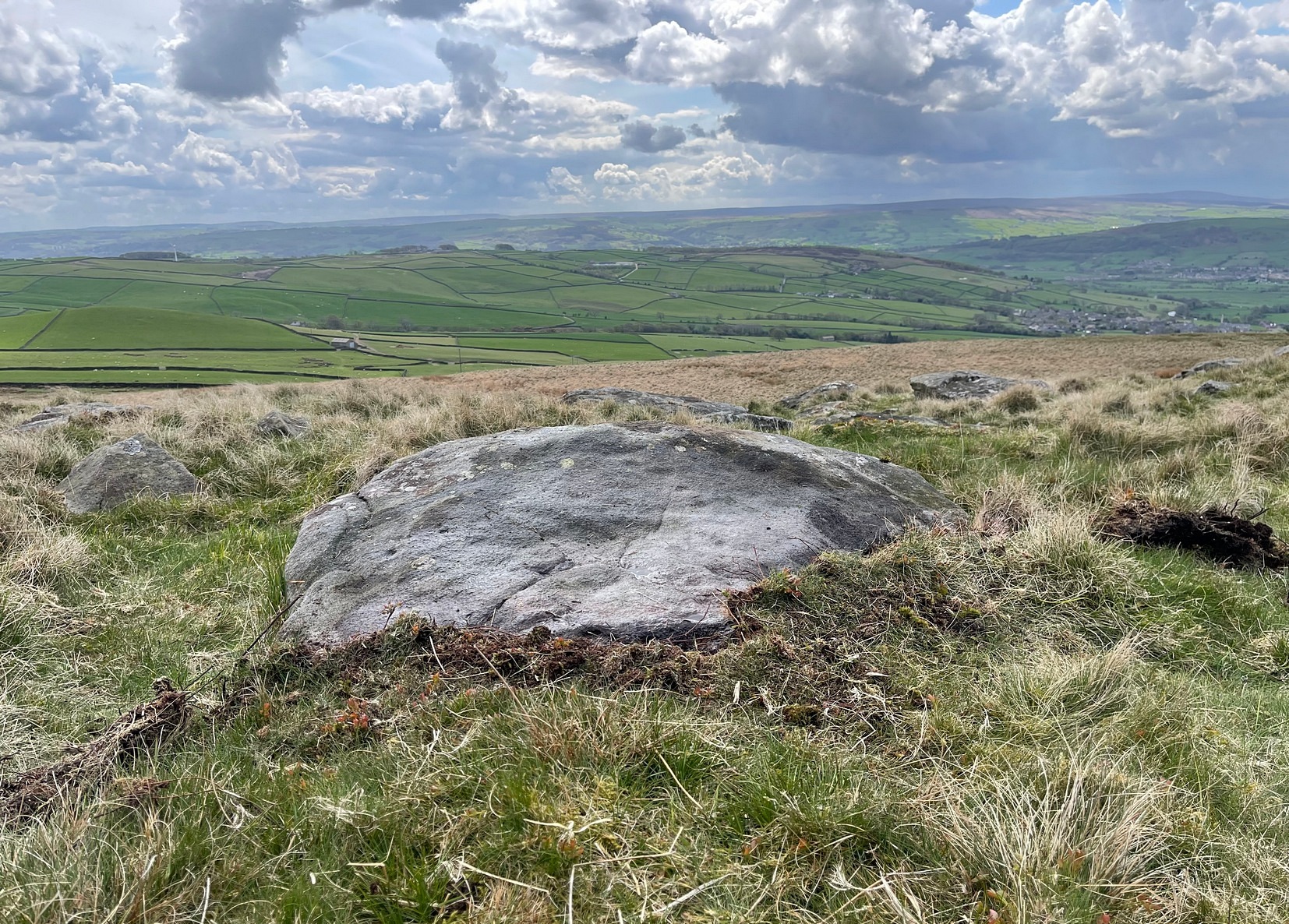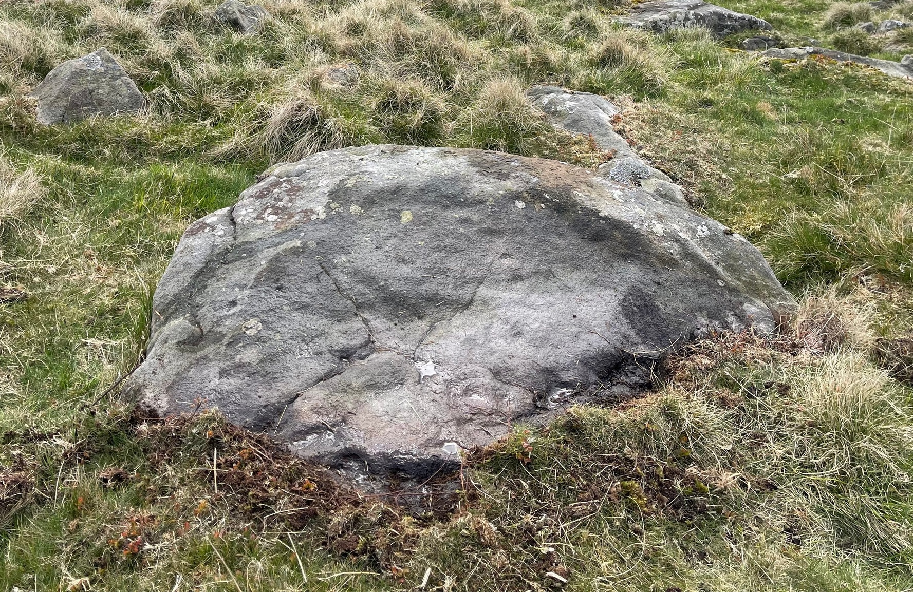 In an area that was extensively cut up by the Industrialists in the 18th and 19th century, Thomas Cleland came across this scarce example of a cup-marked, possibly cup-and-ring marked stone in March 2025 high up on Millstone Hill, where extensive views reach out to the south, east and west, gazing with particular attention to the mightily impressive King and Queen’s cairns, more than 1½ (2.6km) south of here—and which would have stood out much more back then than they do today.