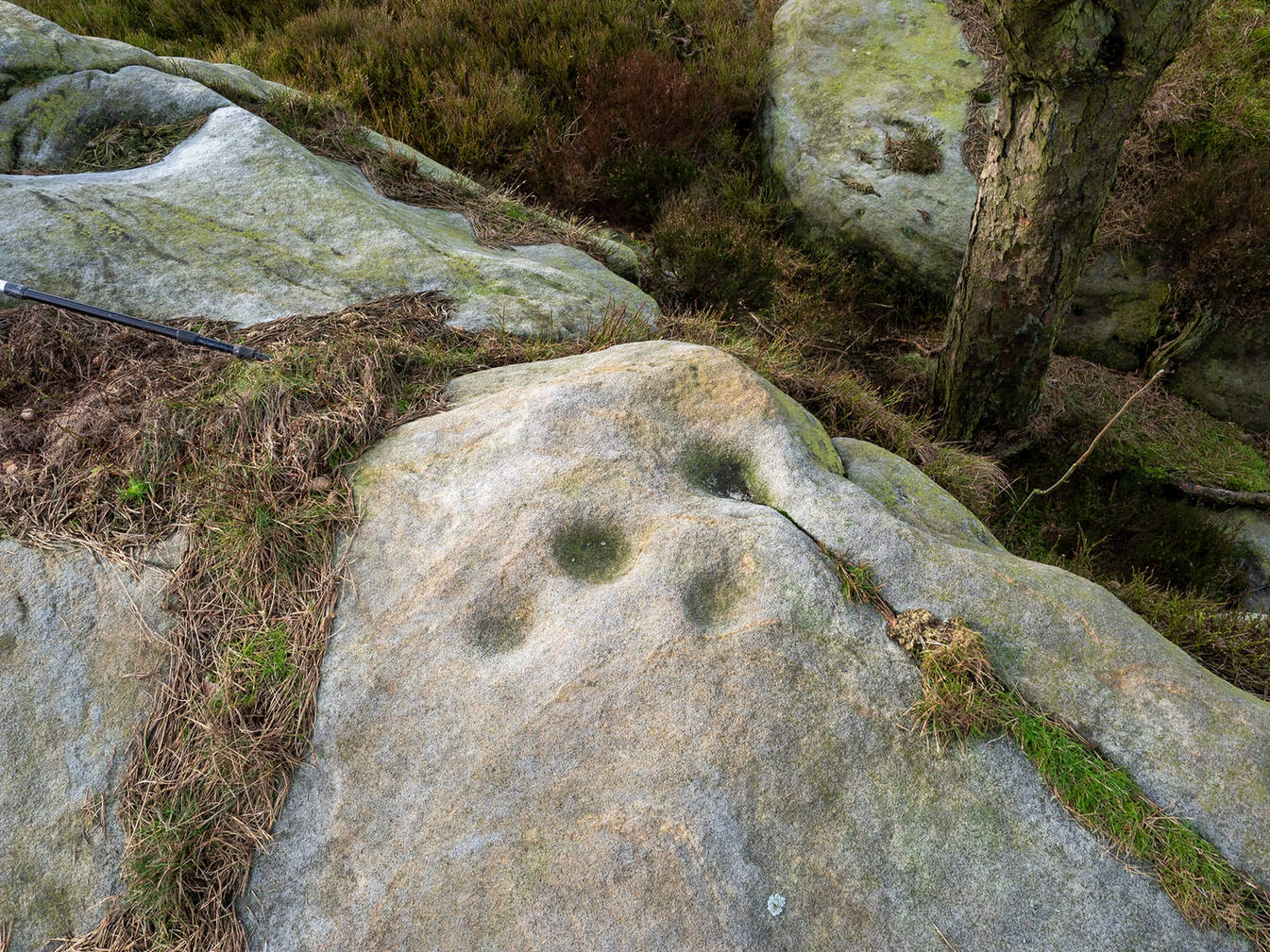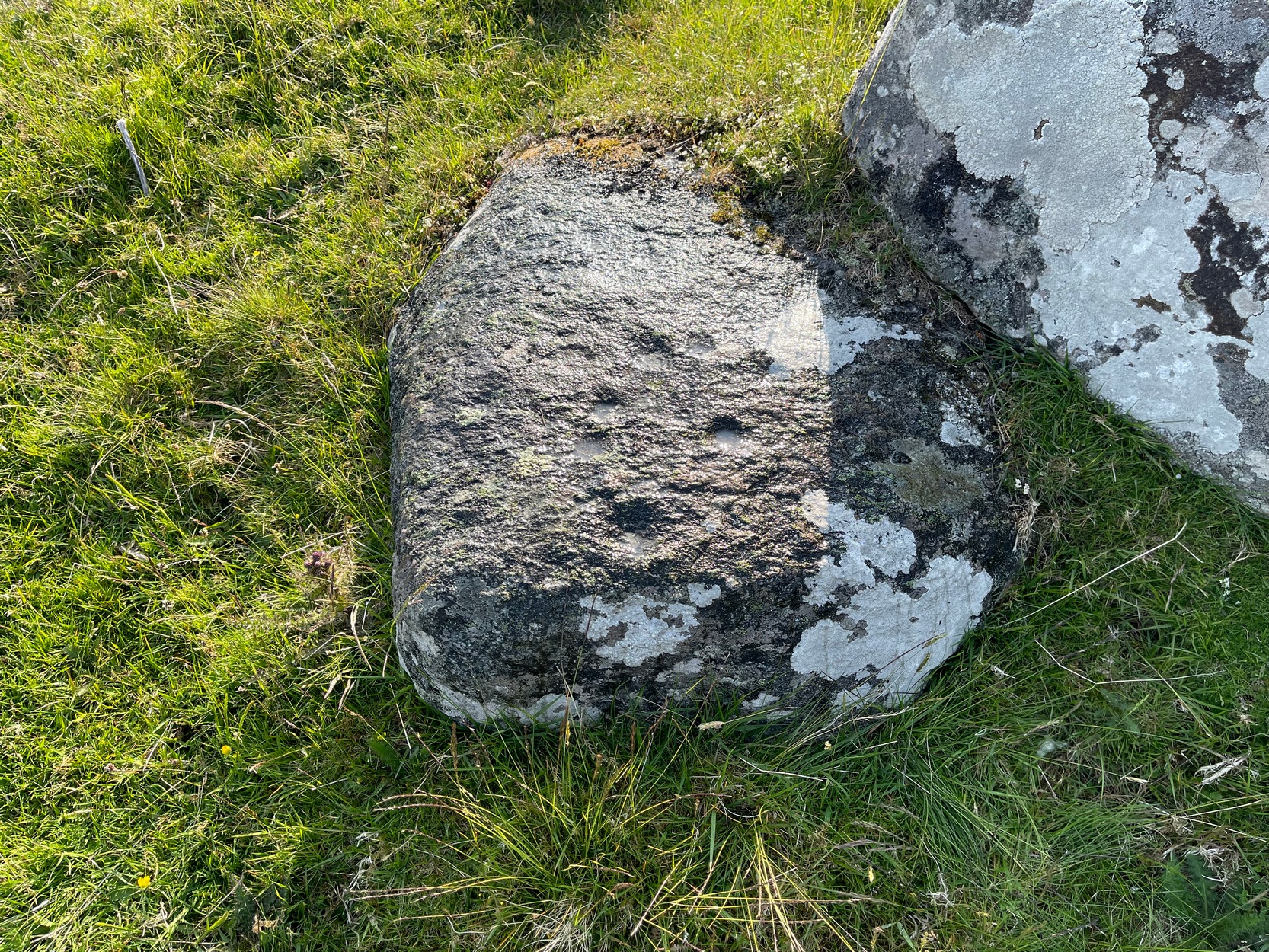 This cup-marked stone was first unearthed by fellow rock art explorers Mike Short and Dave Spencer in 2012 after they’d been looking at some of the other carvings hereby. In peeling back the turf on the stone, otherwise hidden cups—perhaps nine in all—were uncovered that had been hidden for centuries. Most of them are quite distinct, but it seems that a couple of the cups may have been left unfinished, as their size isn’t consistent with the others on this and other carvings close by.