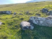 The carved stone—located on the northern edge of the Low Plain prehistoric cemetery—is one in a line of several low earthfast rocks that crosses the track hereby and it’s possible that it was part of some prehistoric walling. Linear remains of walls and ditches were reported here in the 19th century and some of them can still be seen in some places on this part of the hill, but much of it has been destroyed.
